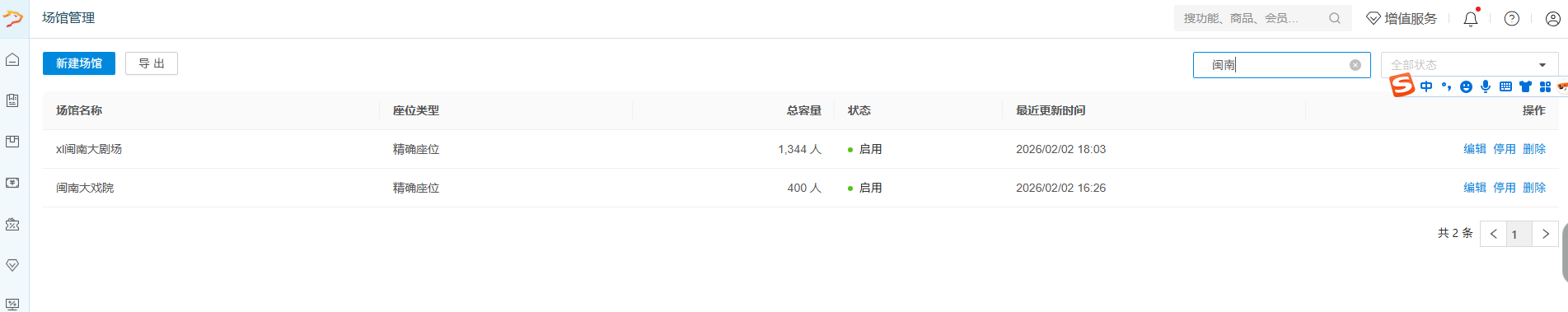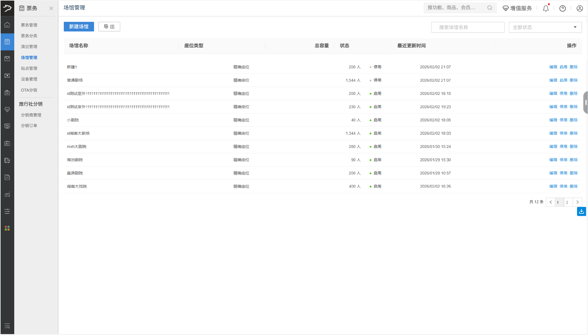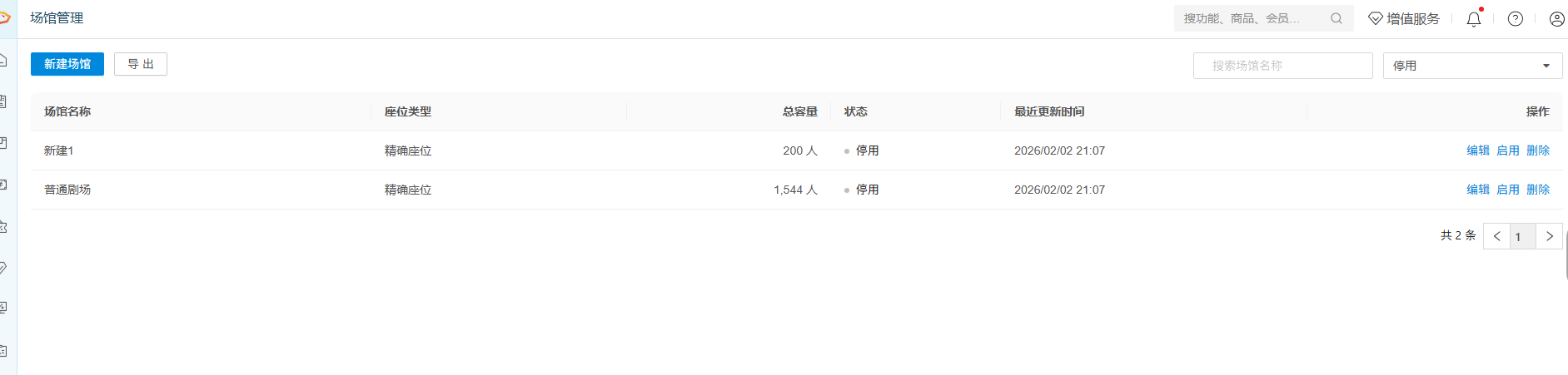 进入场馆列表页,默认展示所有状态(启用 / 停用)的场馆信息,包括场馆名称、座位类型、总容量、状态及最近更新时间。