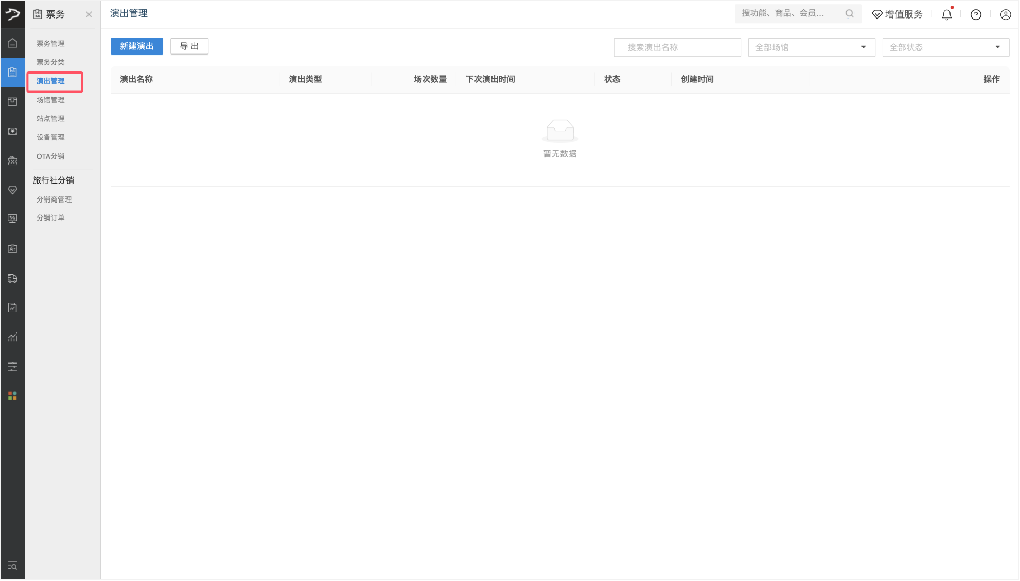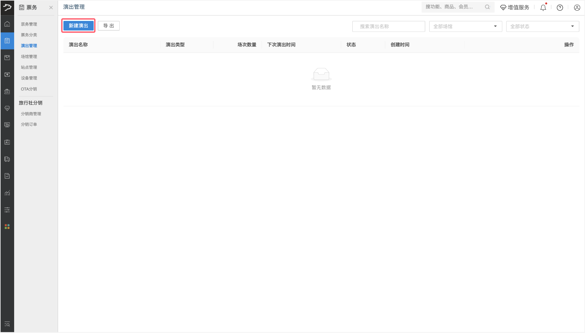 1、进入演出管理页面,点击左上角【新建演出】按钮,进入新建演出页面。