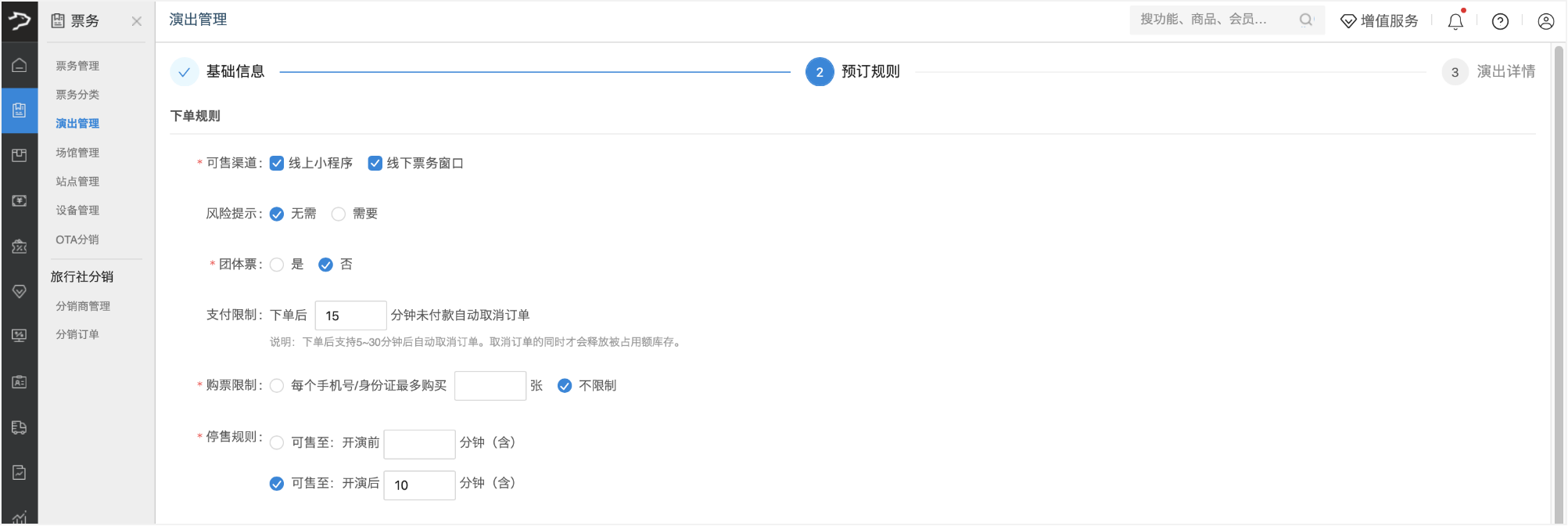 • 可售渠道:支持多选,可选线上小程序、线下票务窗口。