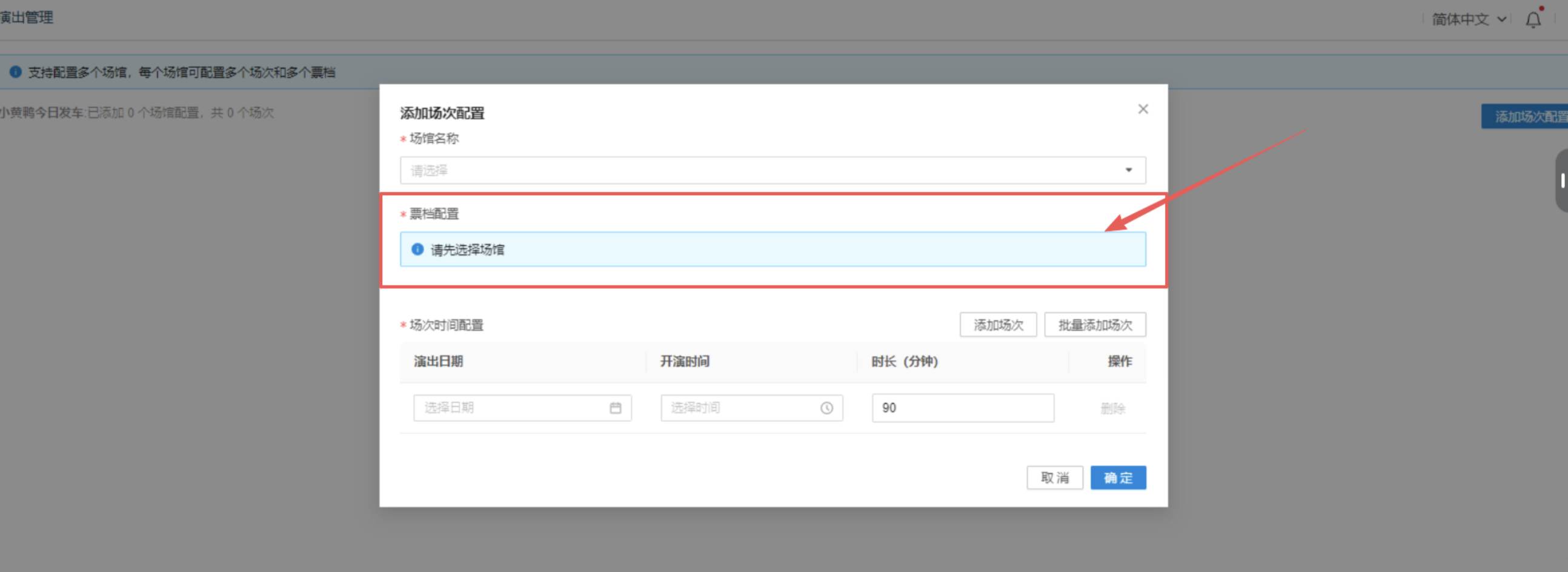 1、选择场馆:点击【场次配置】。