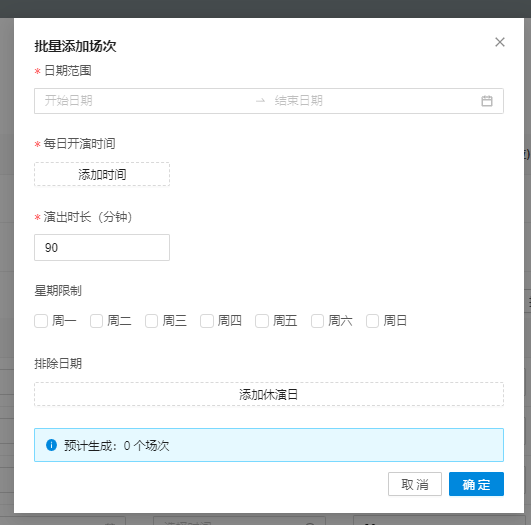 • 点击【确定】:系统计算预计生成数=(符合星期限制的天数-排除日期天数)×每日开演时间数,按日期+开演时间升序添加场次(若与已存在场次冲突,不添加并提示)。