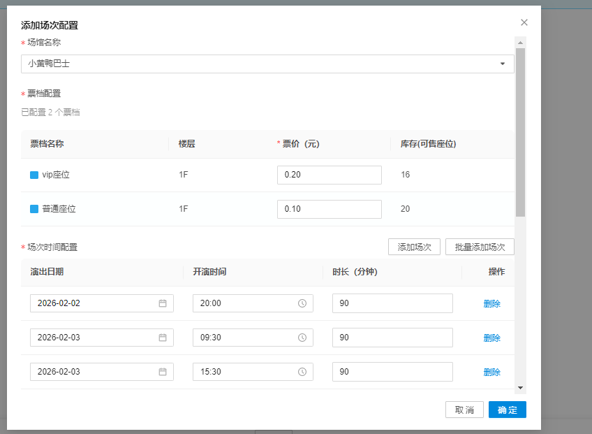 • 删除场馆配置:点击场馆行【删除】,二次确认后删除整行场馆及下属场次(场馆下有已售场次提示“该场馆存在已售场次,无法删除”)。