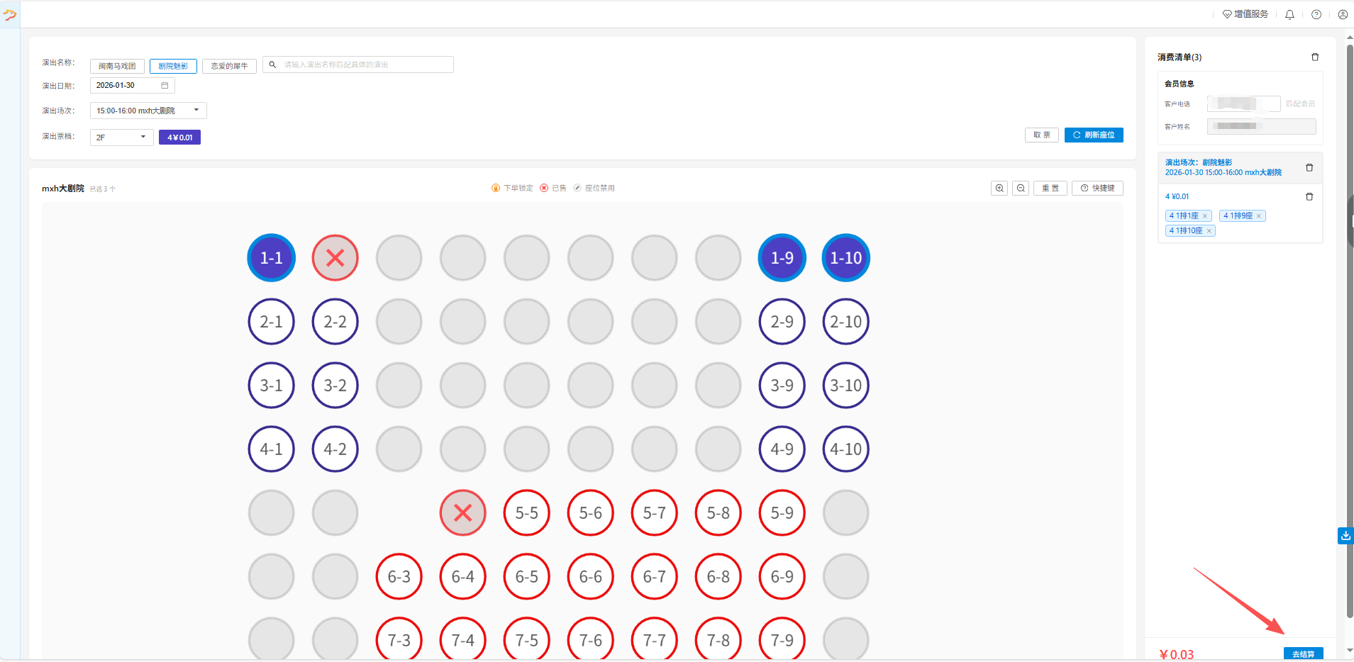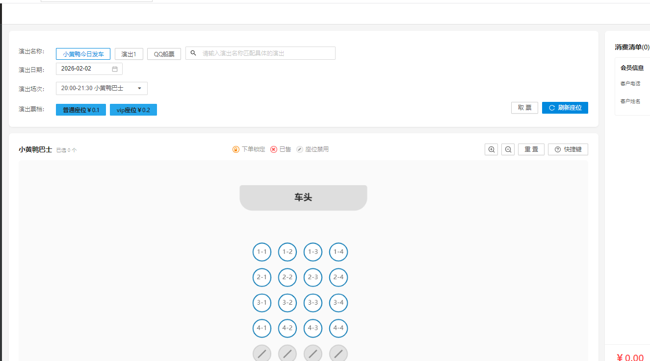 点击预定座位,输入客户电话点击结算提交订单。
