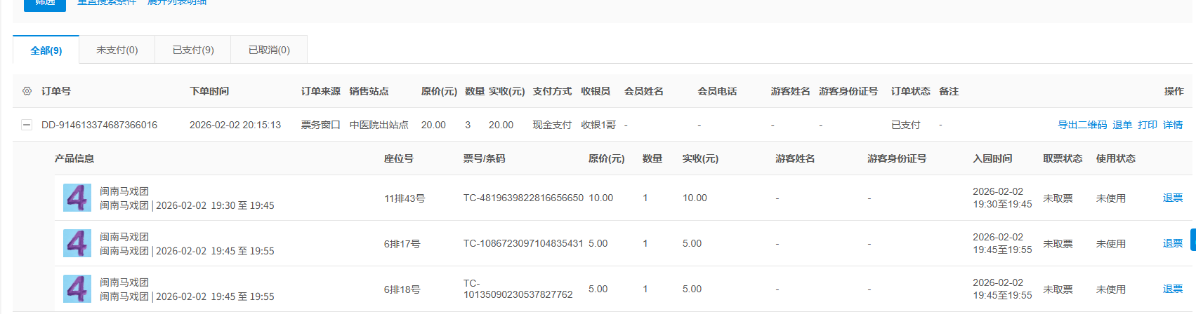 路径:前台-订单,可查看销售订单;如前台无退票权限时需退订,后台-订单-票务订单管理,可对订单进行查看、退票