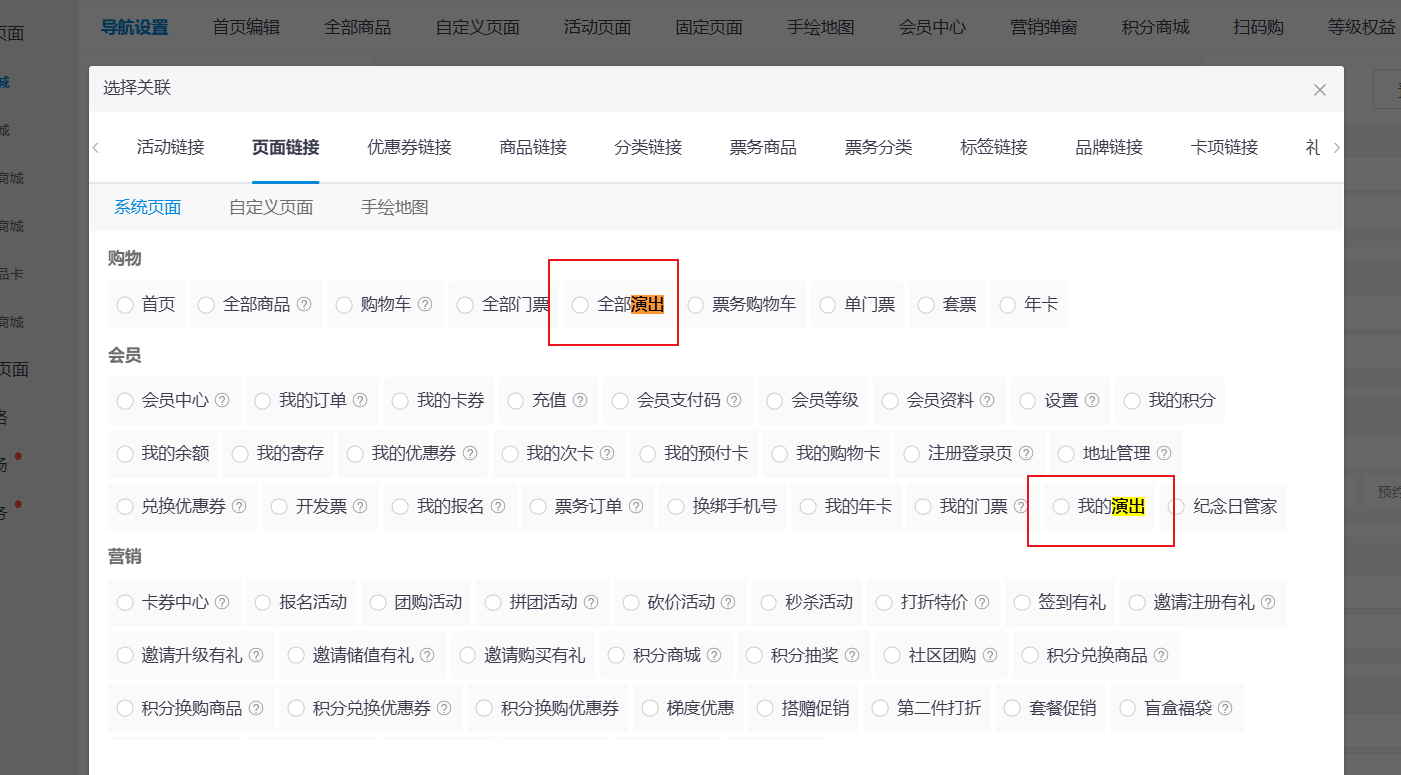 1、导航栏——选择自定义跳转页面,关联【全部演出】全部演出页面,点击保存和发布