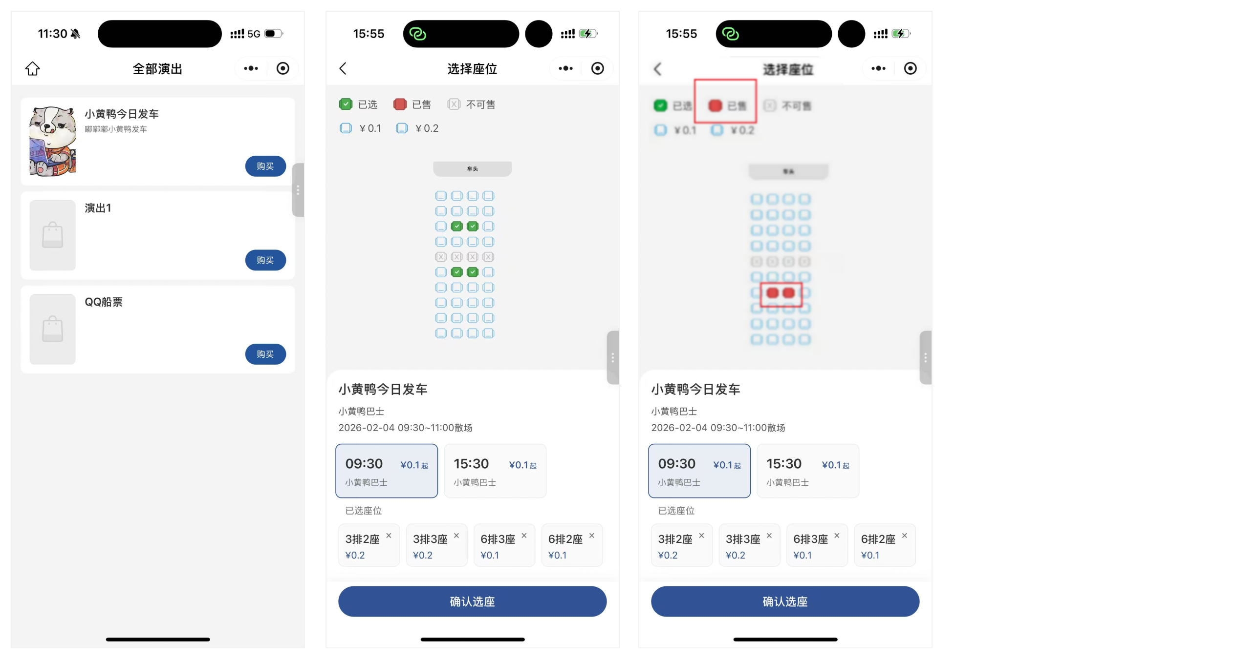 • 可选座位:点击选中(显示选中标识)。