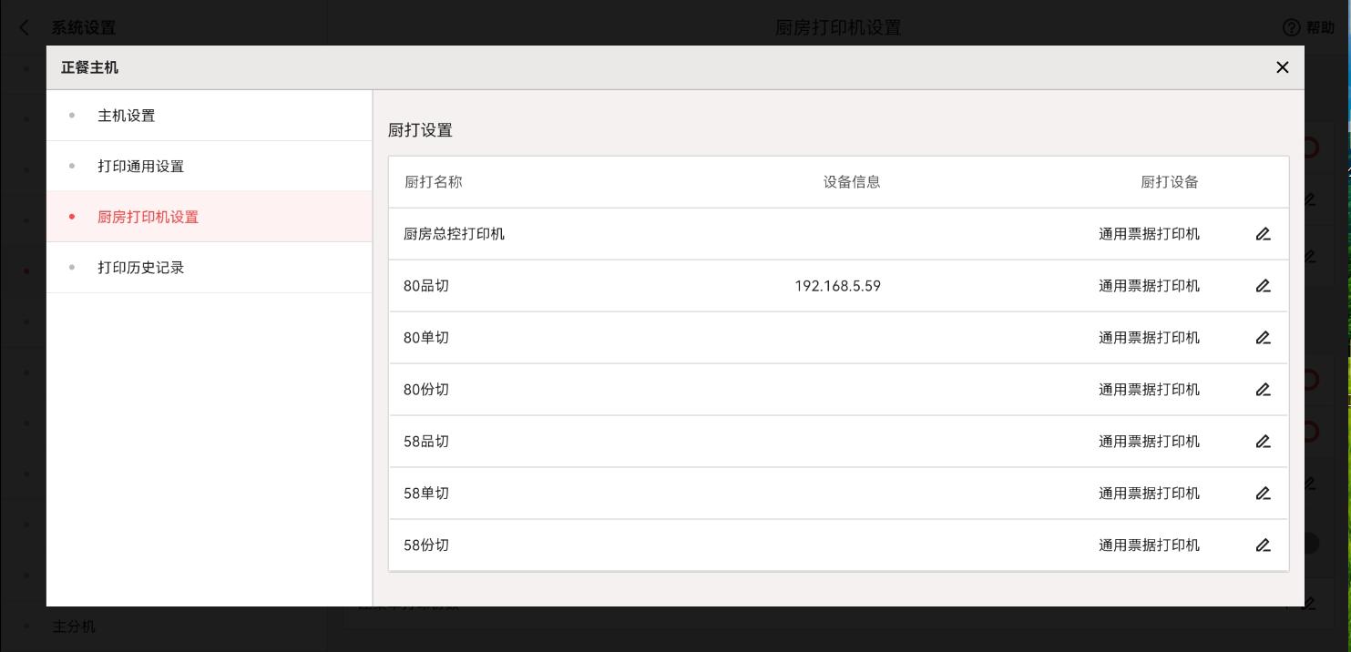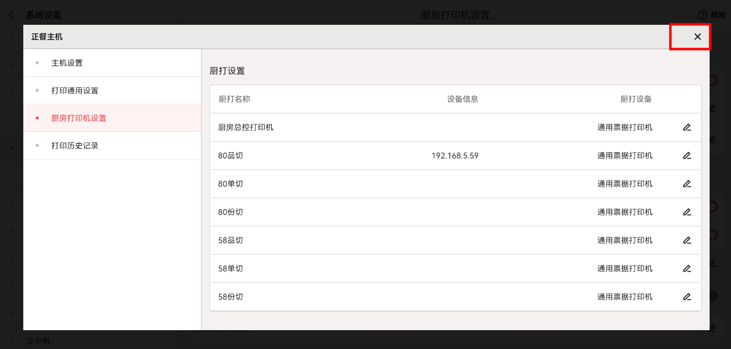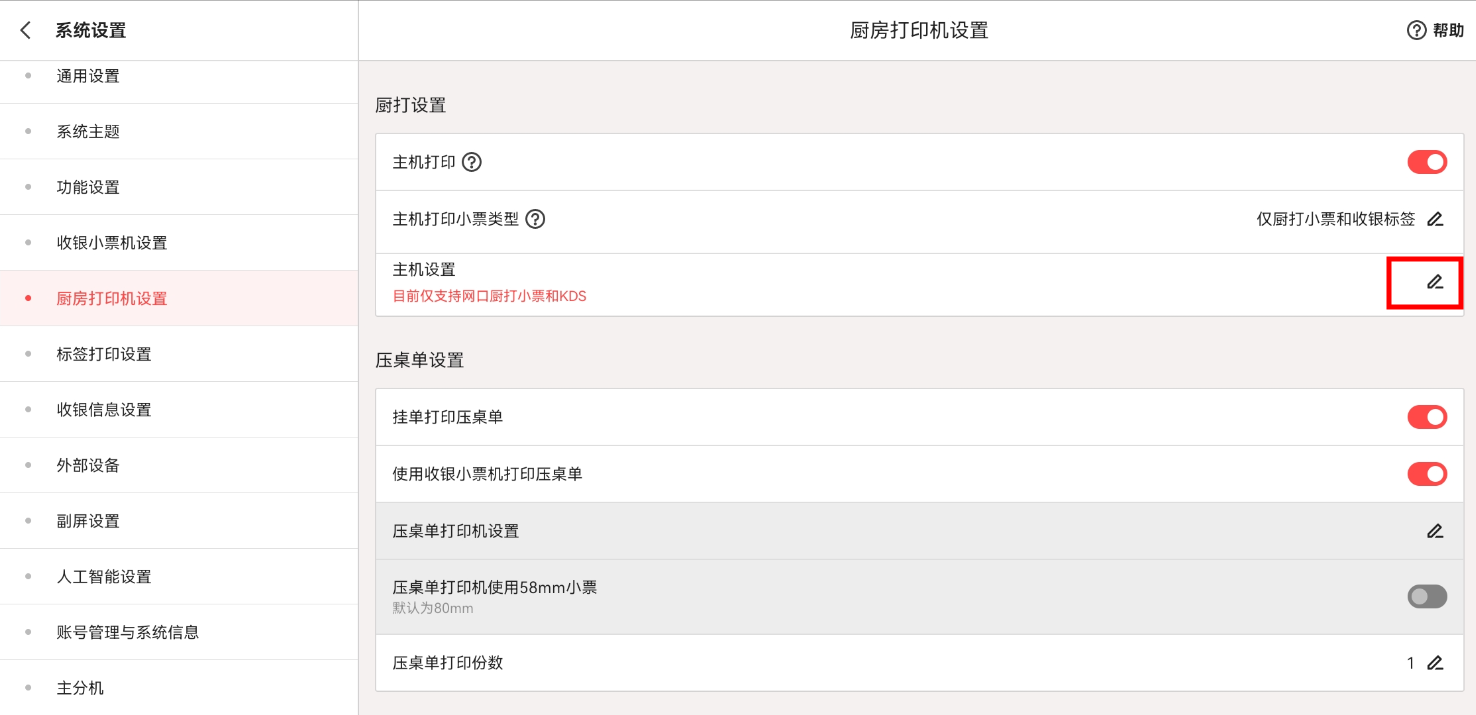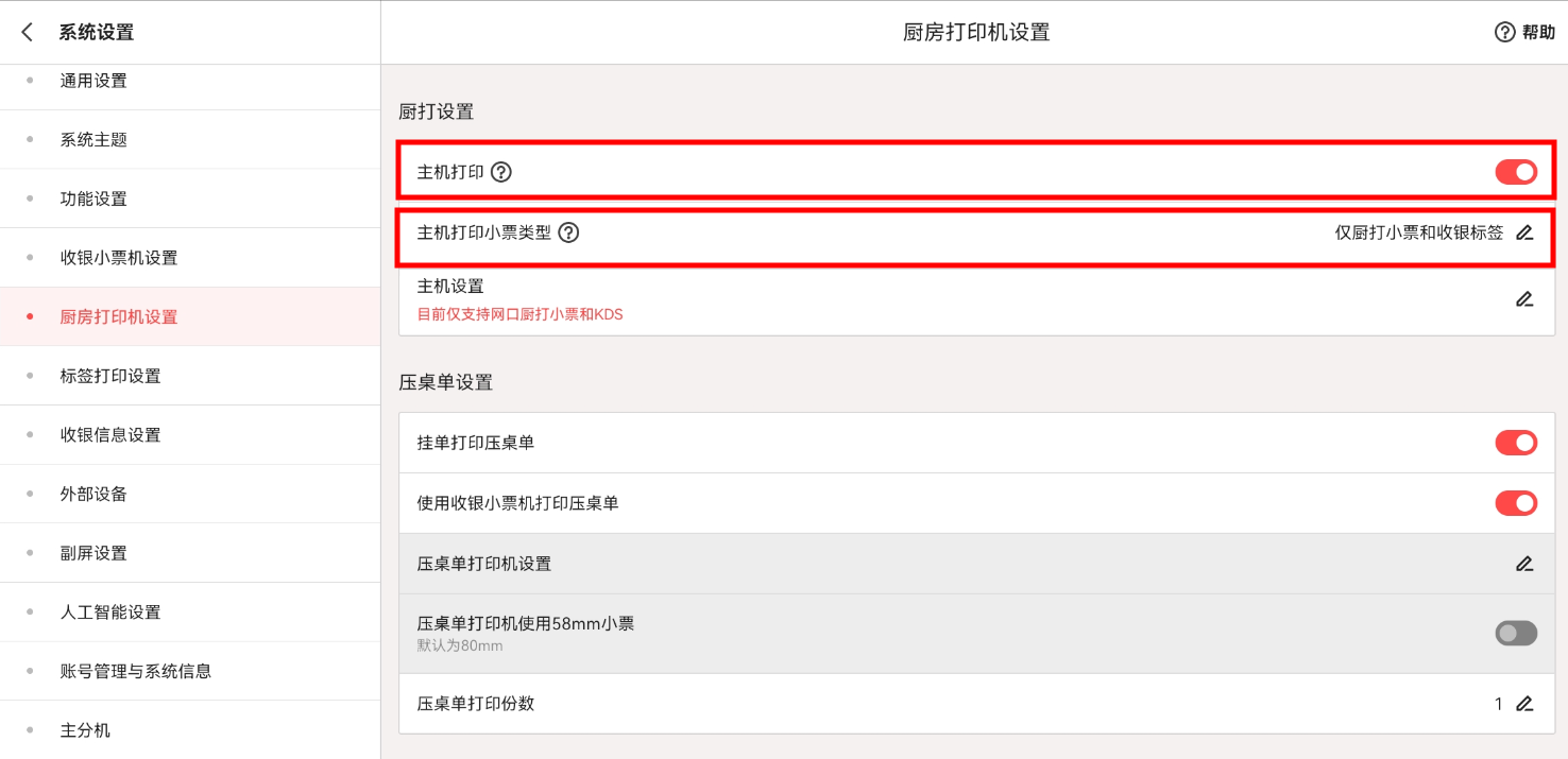 路径 1 :系统设置 > 厨房打印机设置 > 厨打设置 > 主机设置