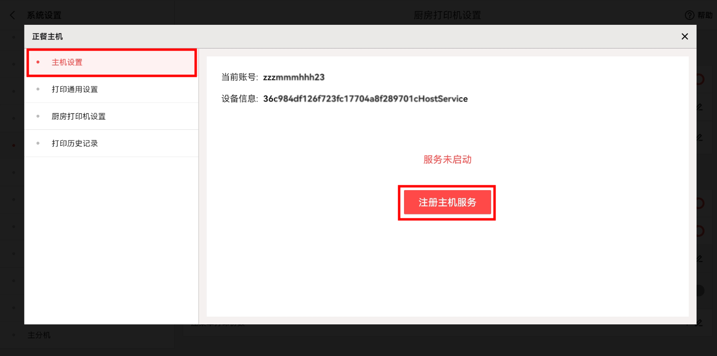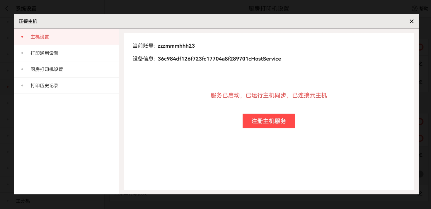 3、在主机设置页面,点击【注册主机服务】按钮,当提示“服务已启动,已运行主机同步,已连接云主机”,即代表主机打印工具启动成功。
