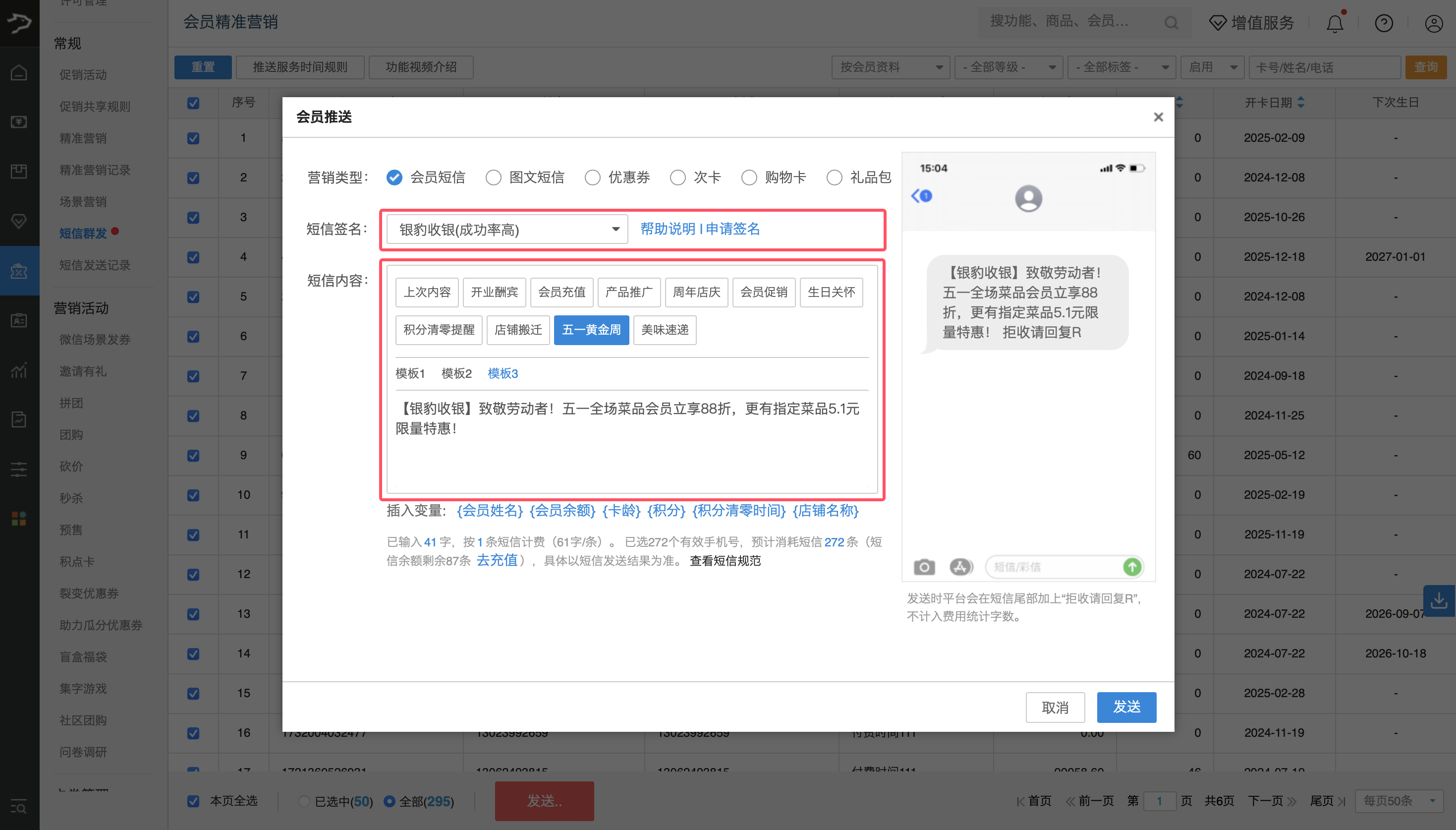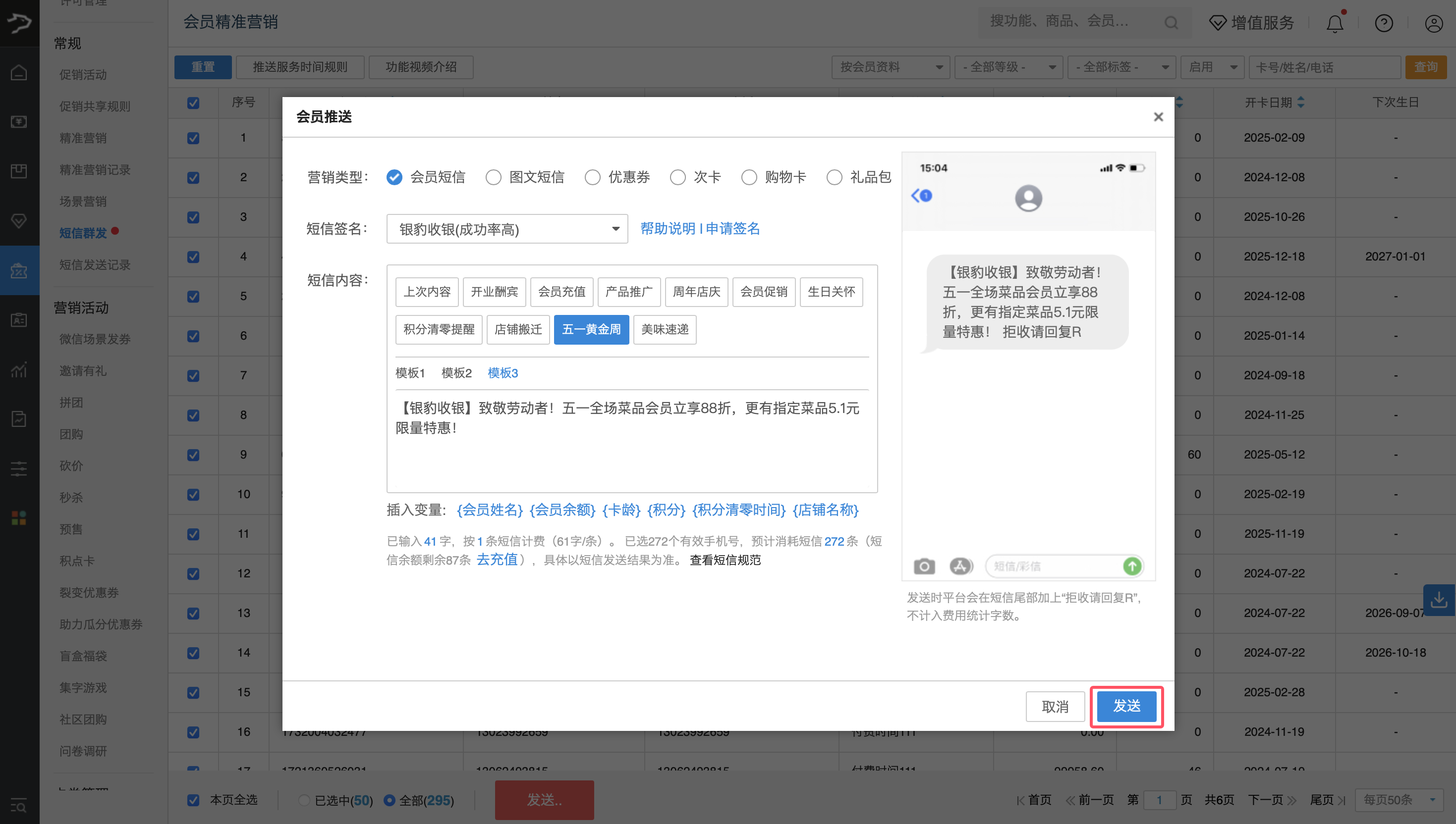 ① 选择要发送短信的会员群体,点击【发送】按键。