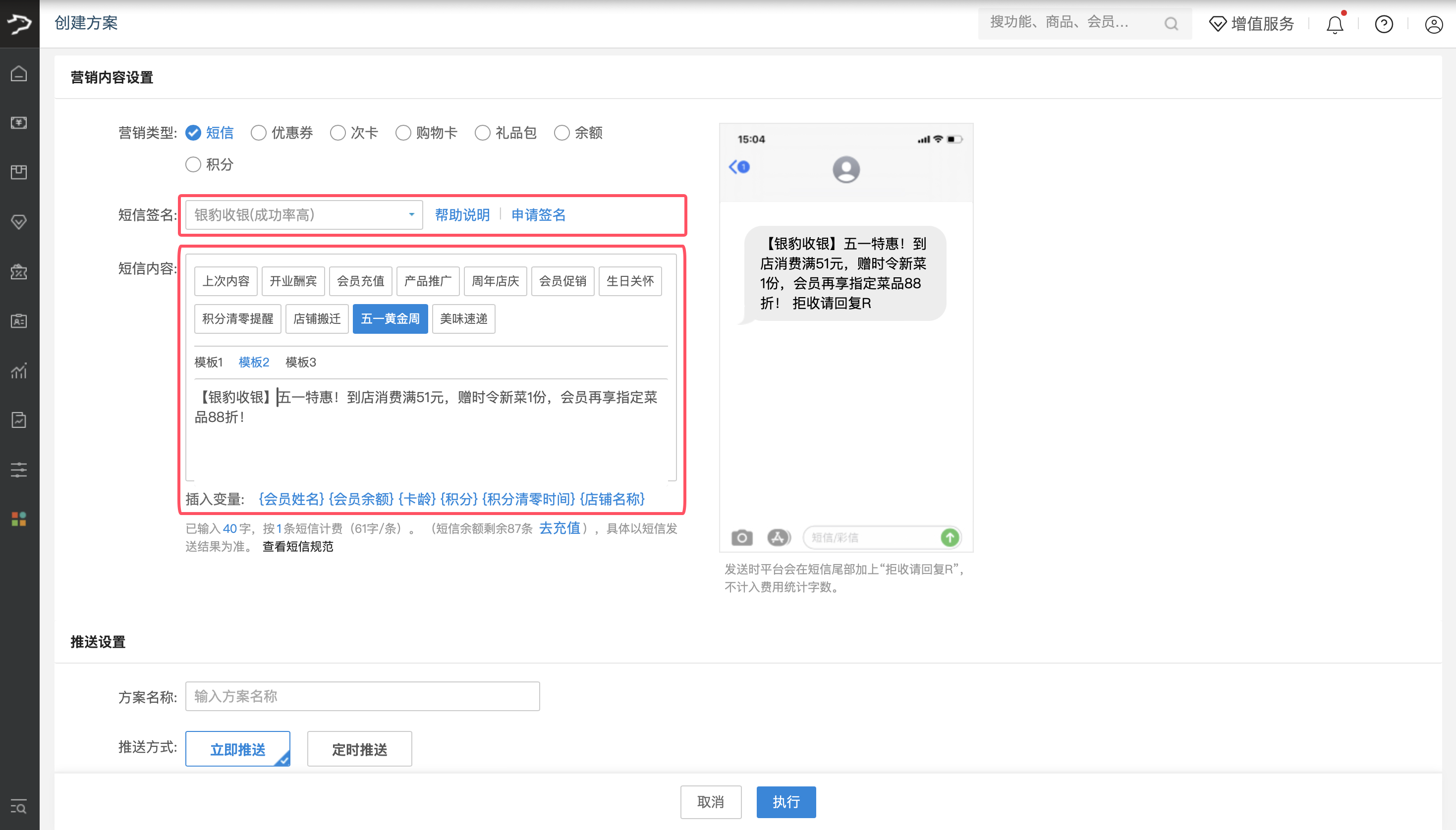 ② 选择营销签名,编辑短信内容,可自由编辑,也可选用系统模板,不同场景有丰富模板供参考。
