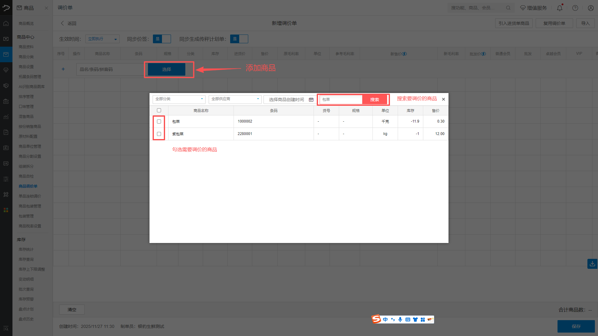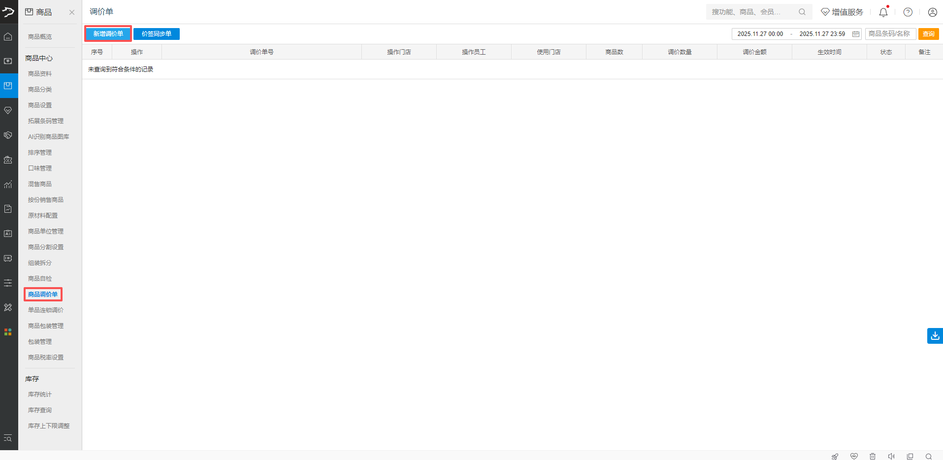 登录银豹云后台-【商品】-【调价单】-新增调价单