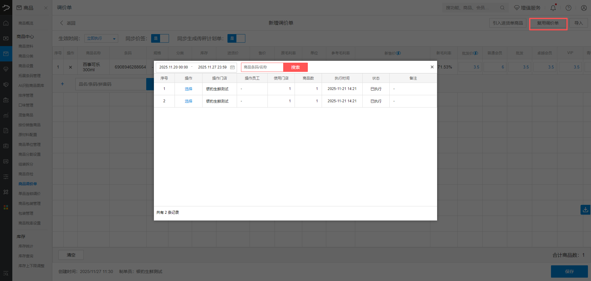 在新增调价单页面,点击右上角【复用调价单】按钮,在弹窗中可通过筛选时间范围或搜索商品条码/名称找到调价单,点击【选择】按钮,即可将该调价单中的商品信息复用到当前新增的调价单中。