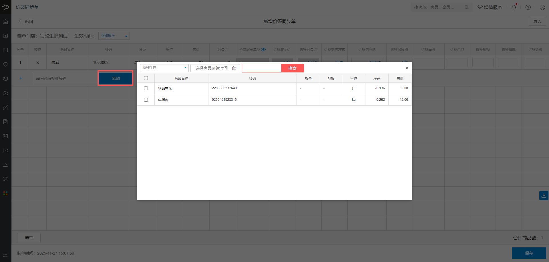 在新增价签同步单页面,点击【添加】按钮,在弹窗中通过筛选商品分类、选择商品创建时间或搜索商品名称找到要添加的商品,勾选后完成添加。