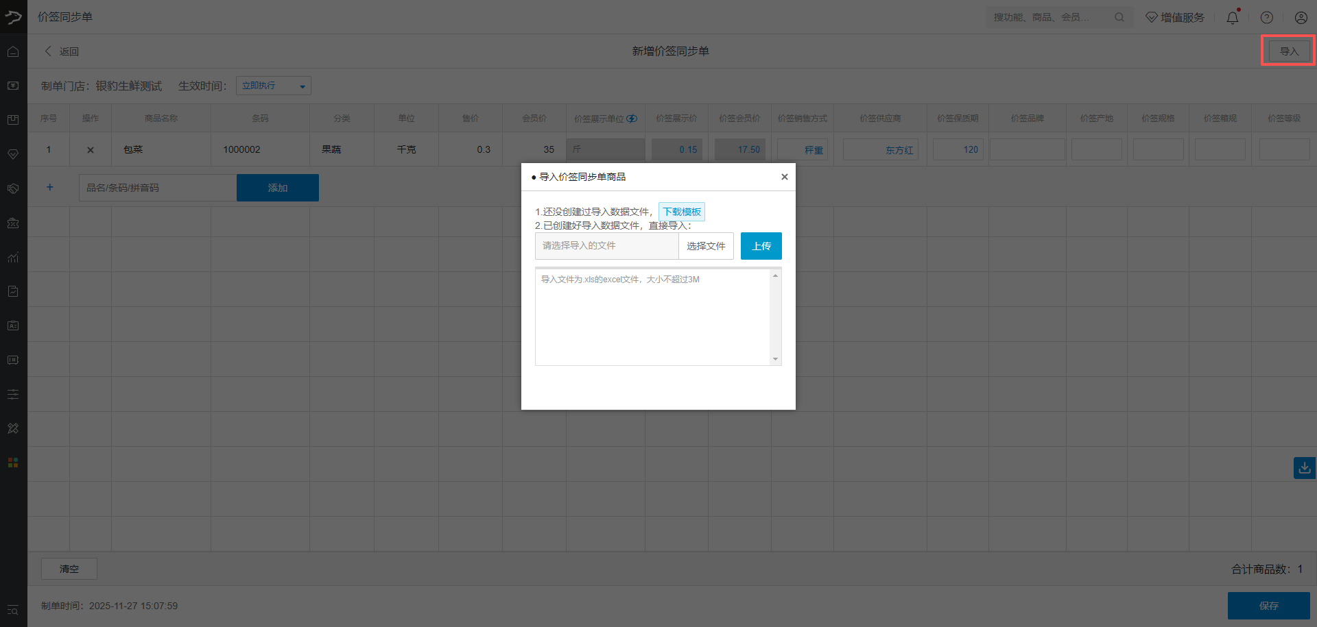 在新增价签同步单页面,点击右上角【导入】按钮,在弹窗中按以下步骤操作: