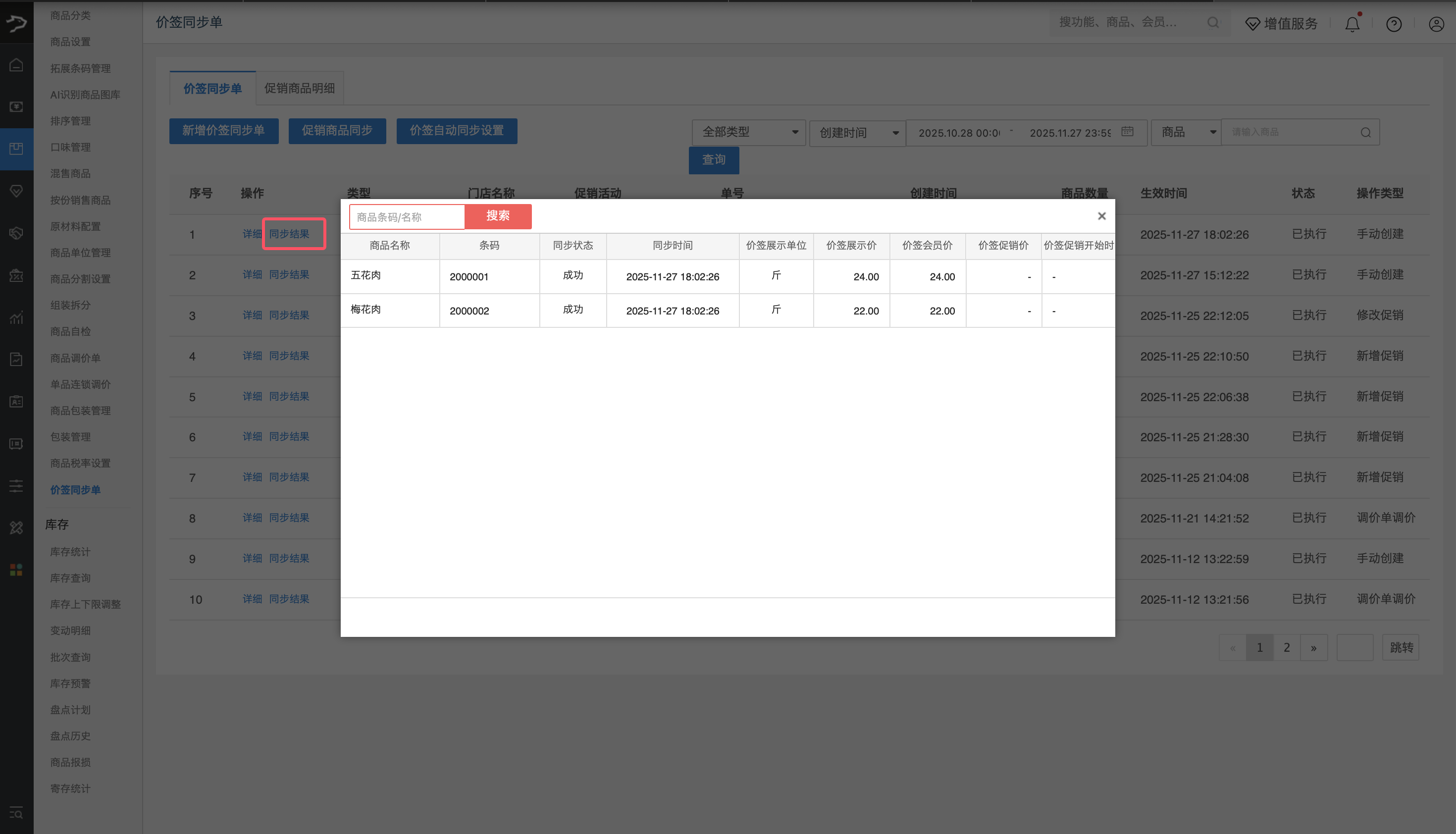 在价签同步单列表页,可通过筛选同步单类型、时间范围,或输入商品信息 / 单号找到要查看的同步单,点击【同步结果】按钮,即可查看该同步单下商品的详细同步信息(包含商品名称、条码、同步状态、价签展示价等内容)。
