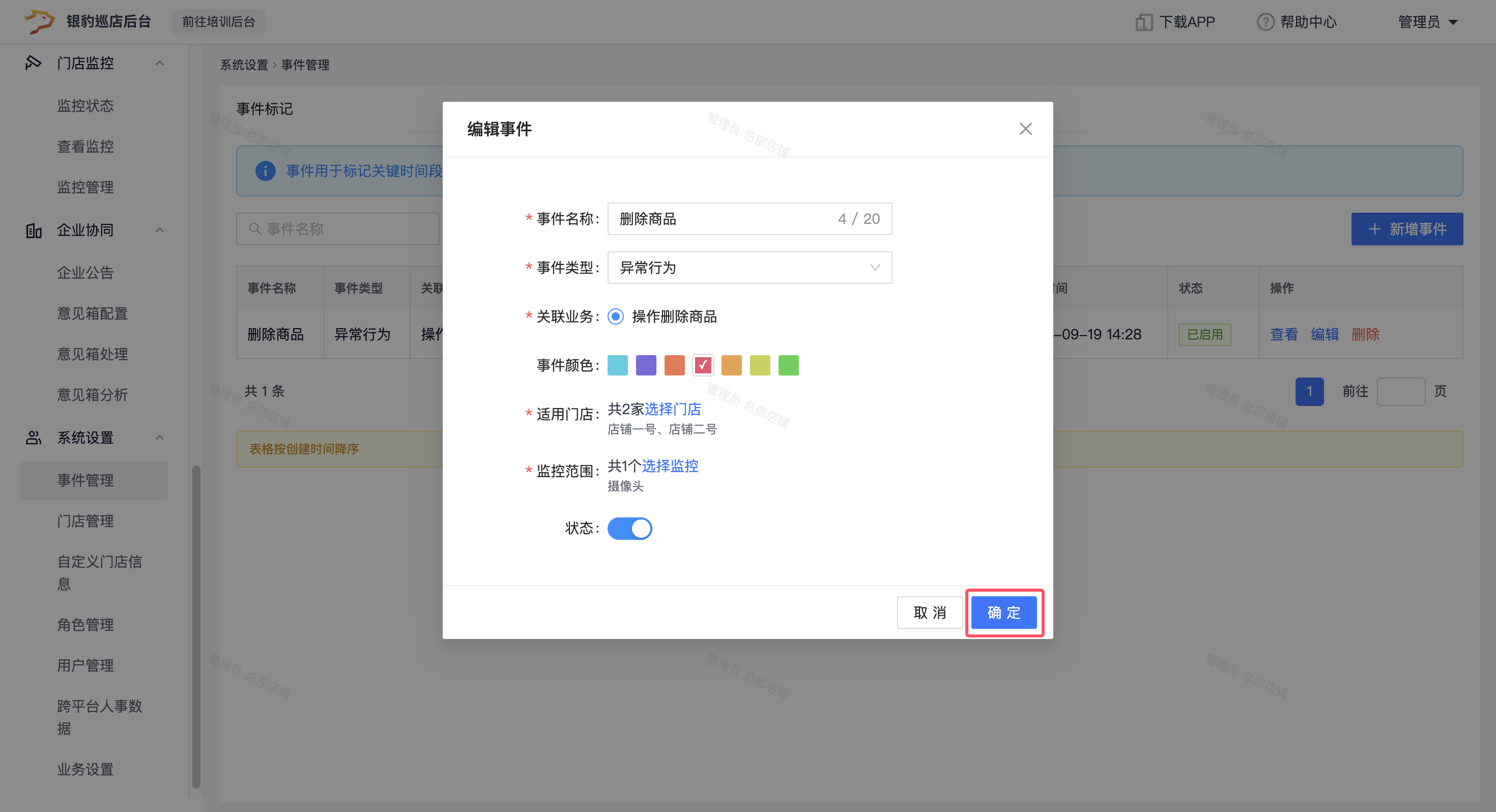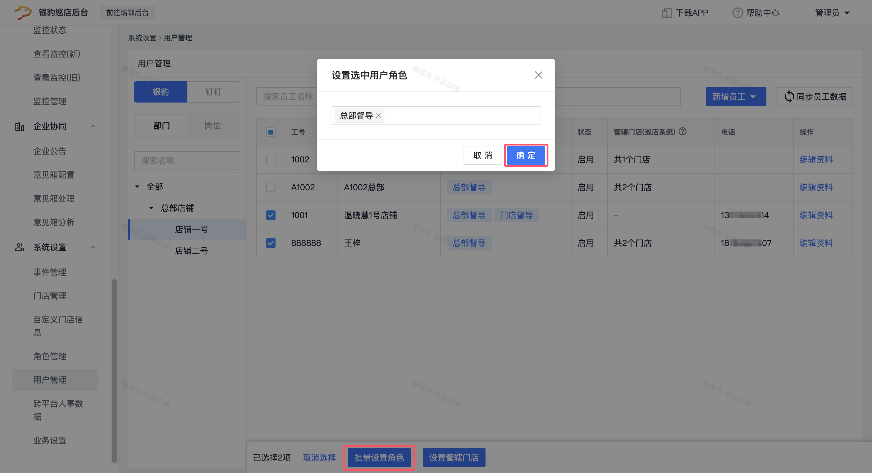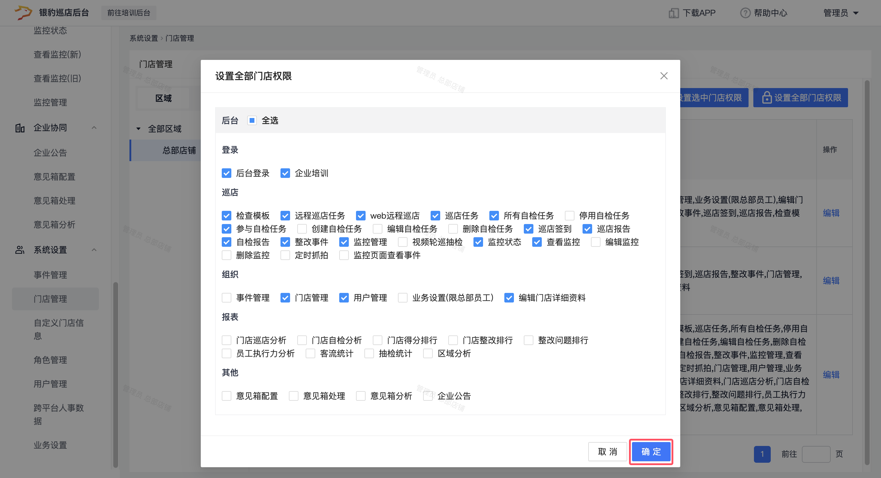 3、在弹出窗口中,勾选所需权限(如 “门店管理” 编辑权限),点击【确定】即可即时生效。