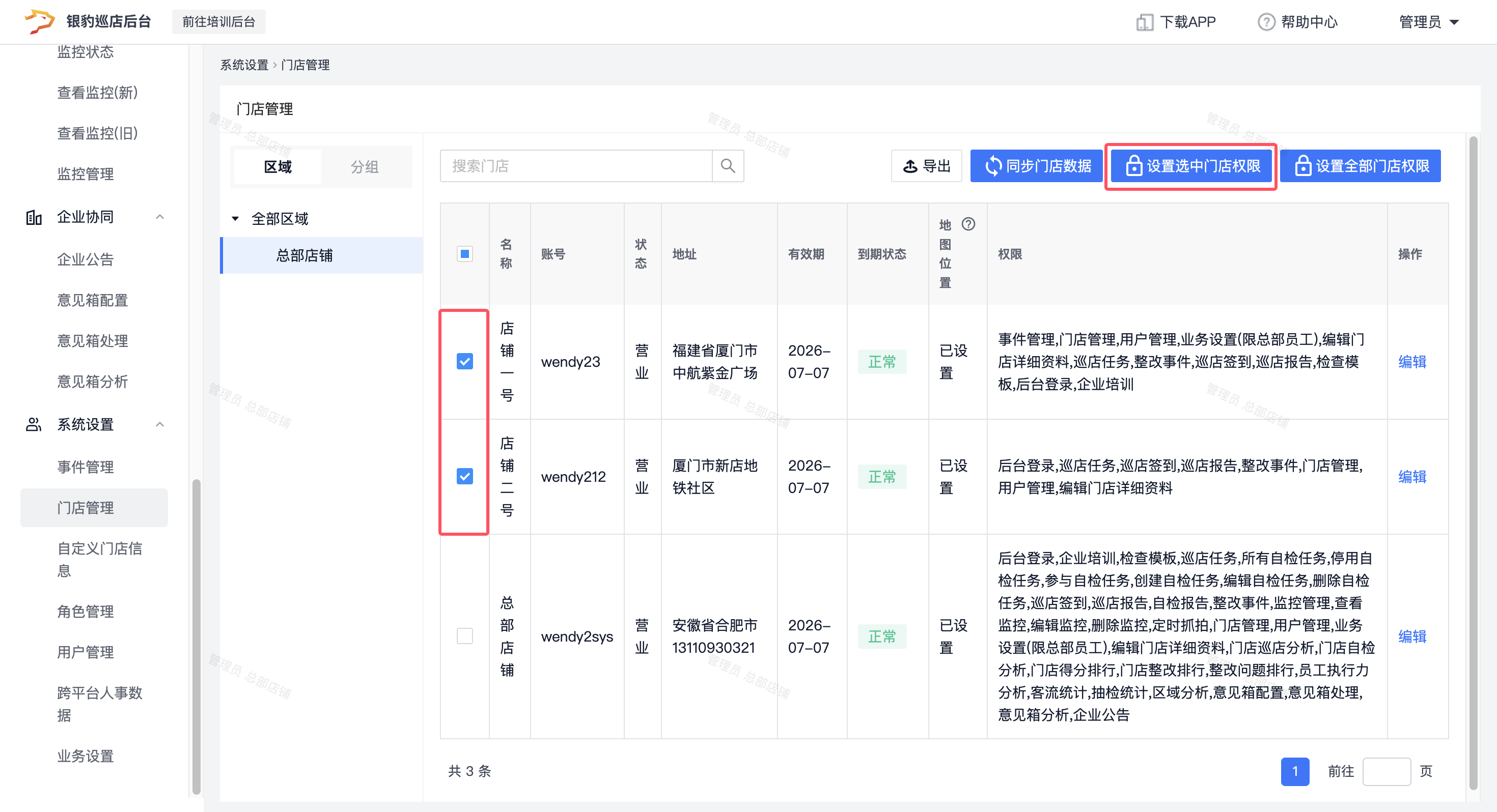 单个 / 部分门店:勾选目标门店,点击右上角【设置选中门店权限】。