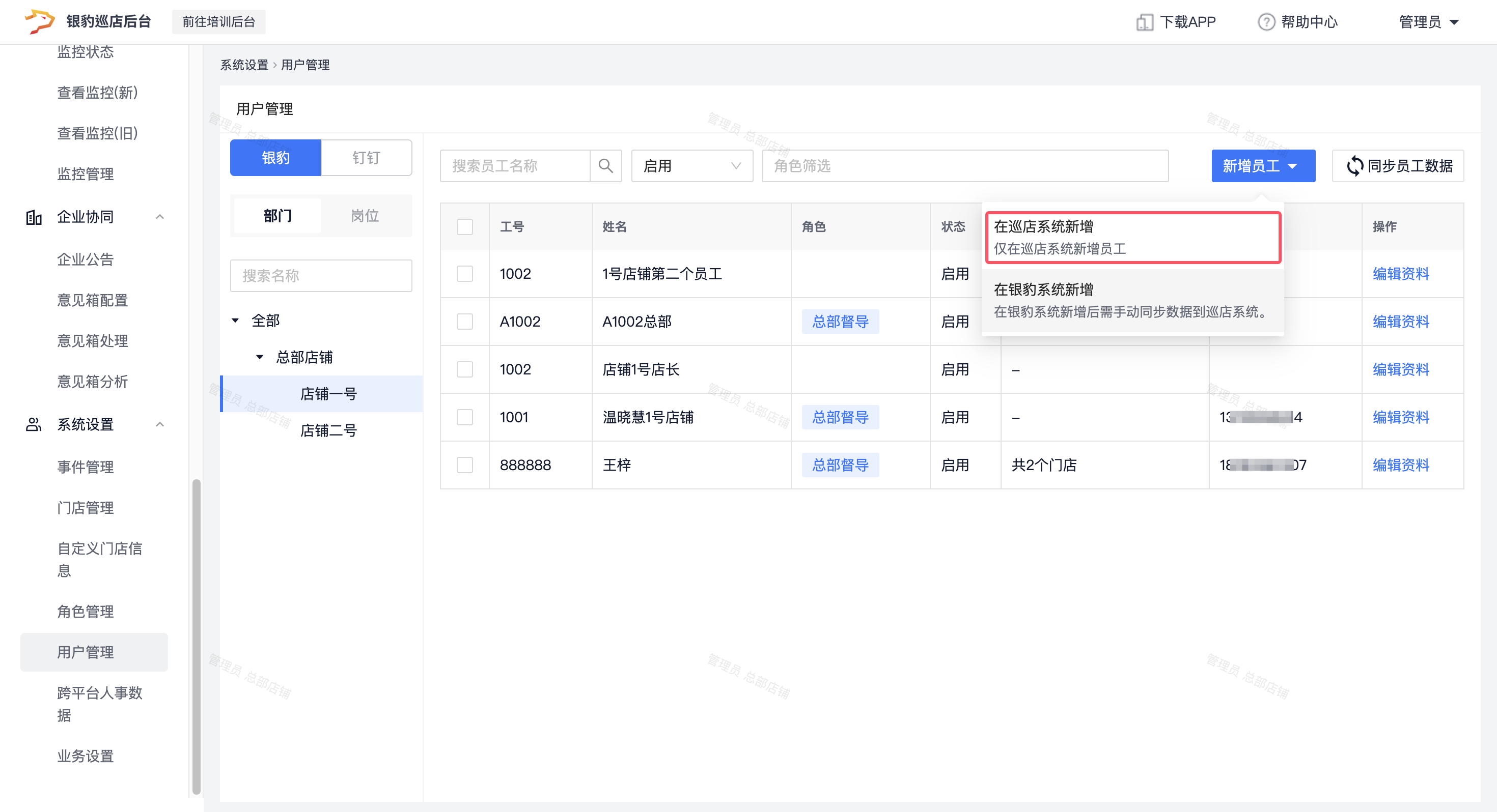 巡店系统新增员工分两种方式:一是在巡店系统新增,二是在银豹系统新增,操作如下: