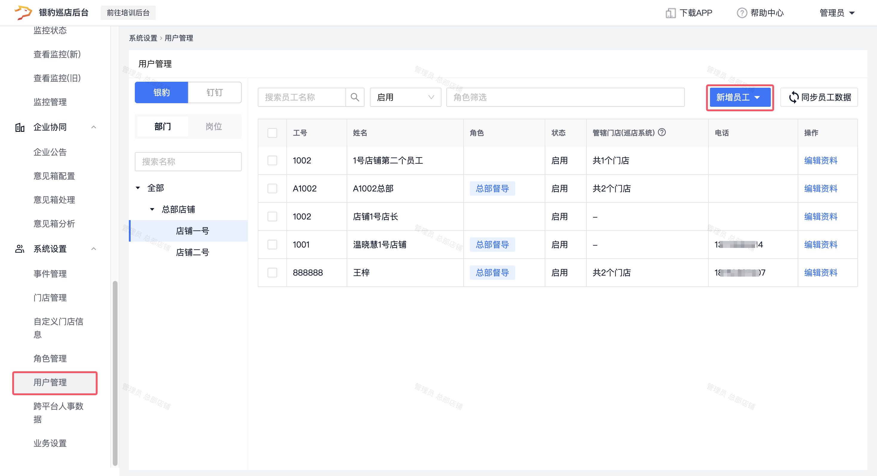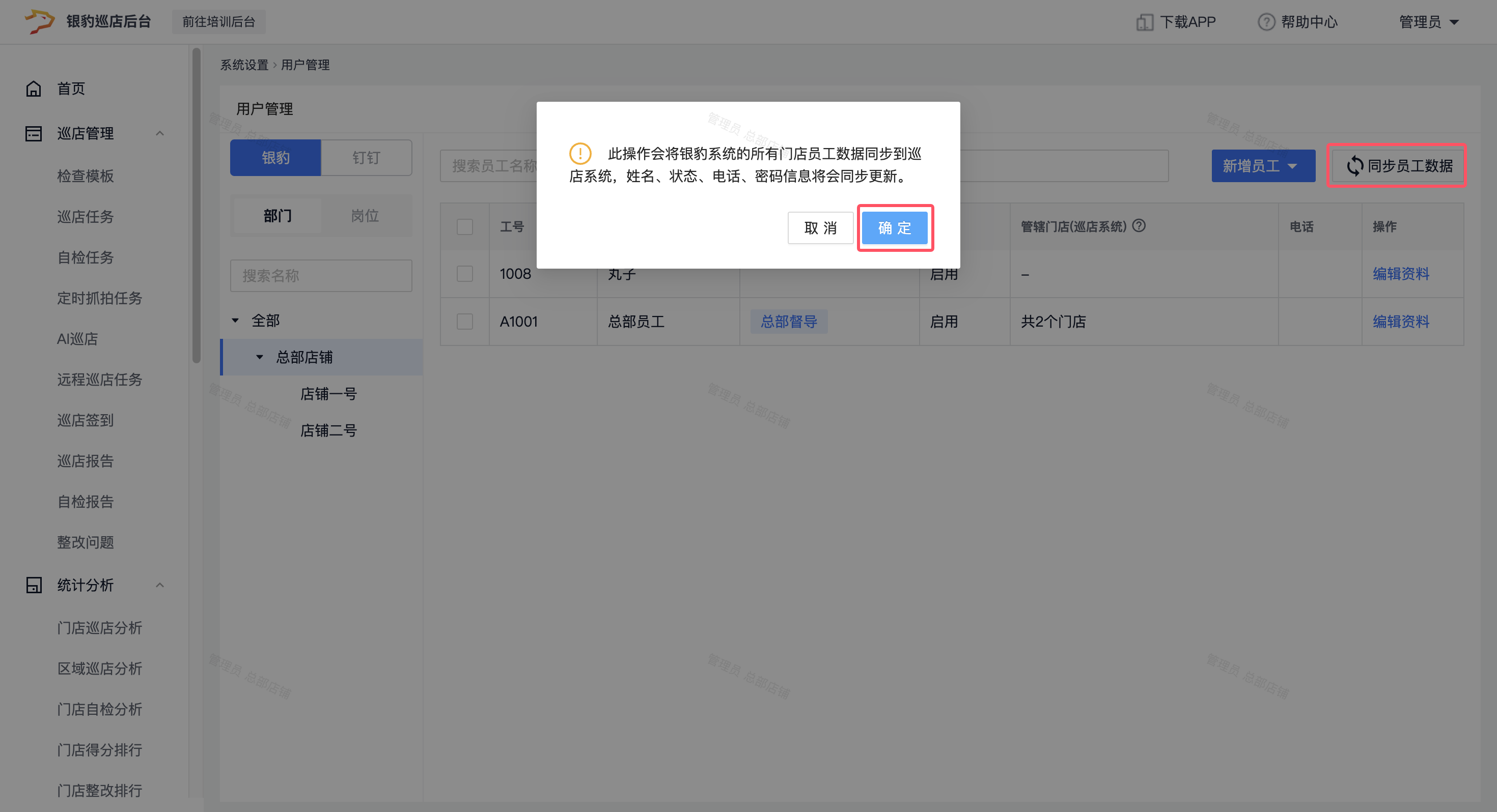 ④ 银豹系统新增员工后,返回巡店后台【用户管理】页面,点击右上角的【同步员工数据】,在弹出的确认提示框中点击【确定】即可。