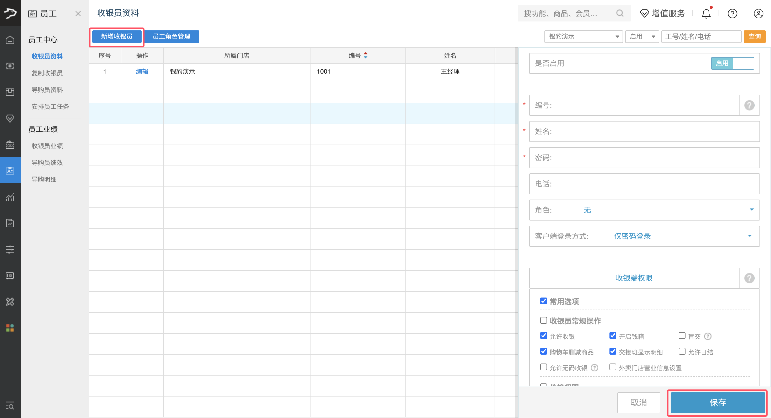 ③ 点【新增收银员】,编辑填些资料后点击【保存】。