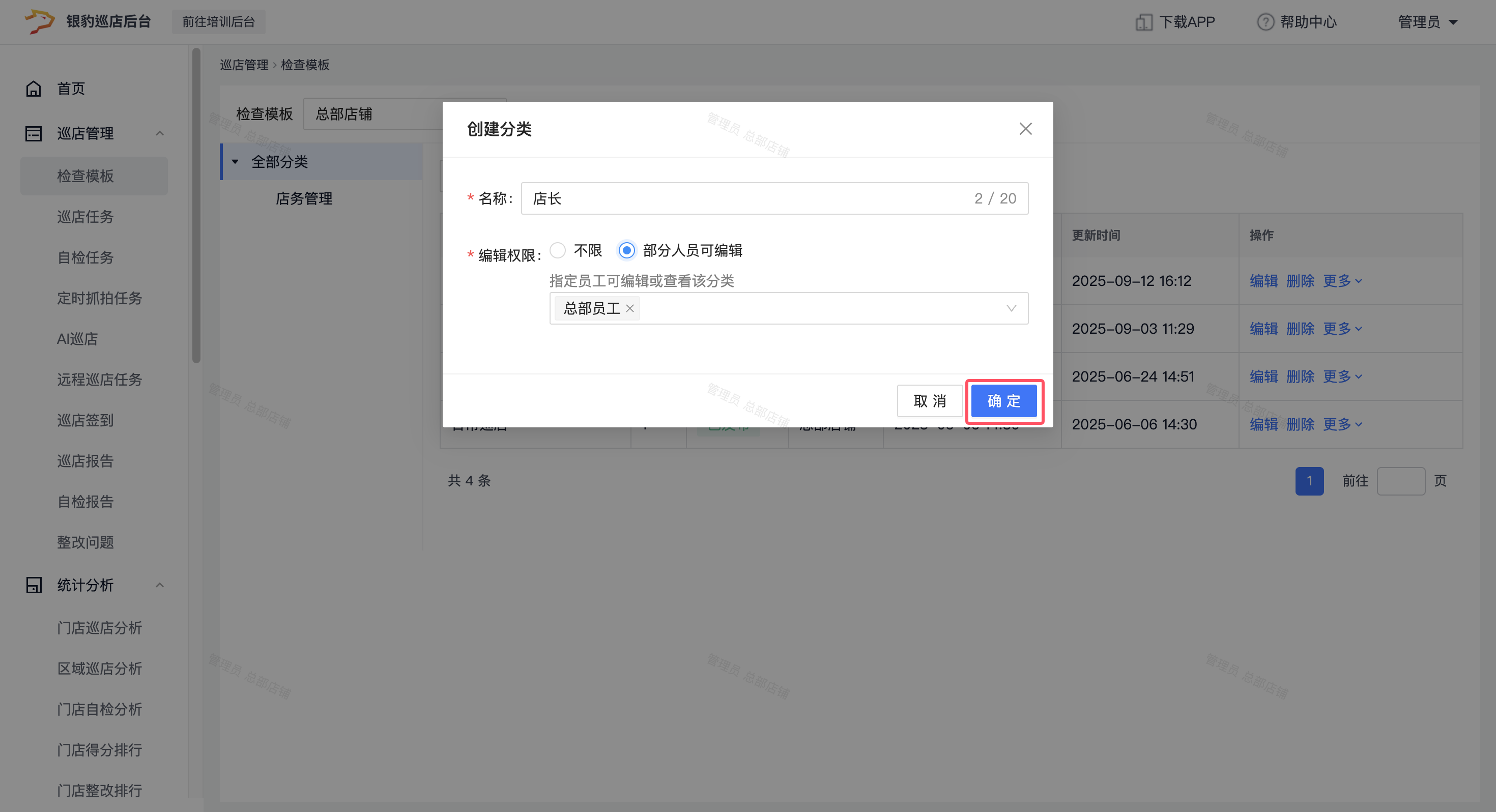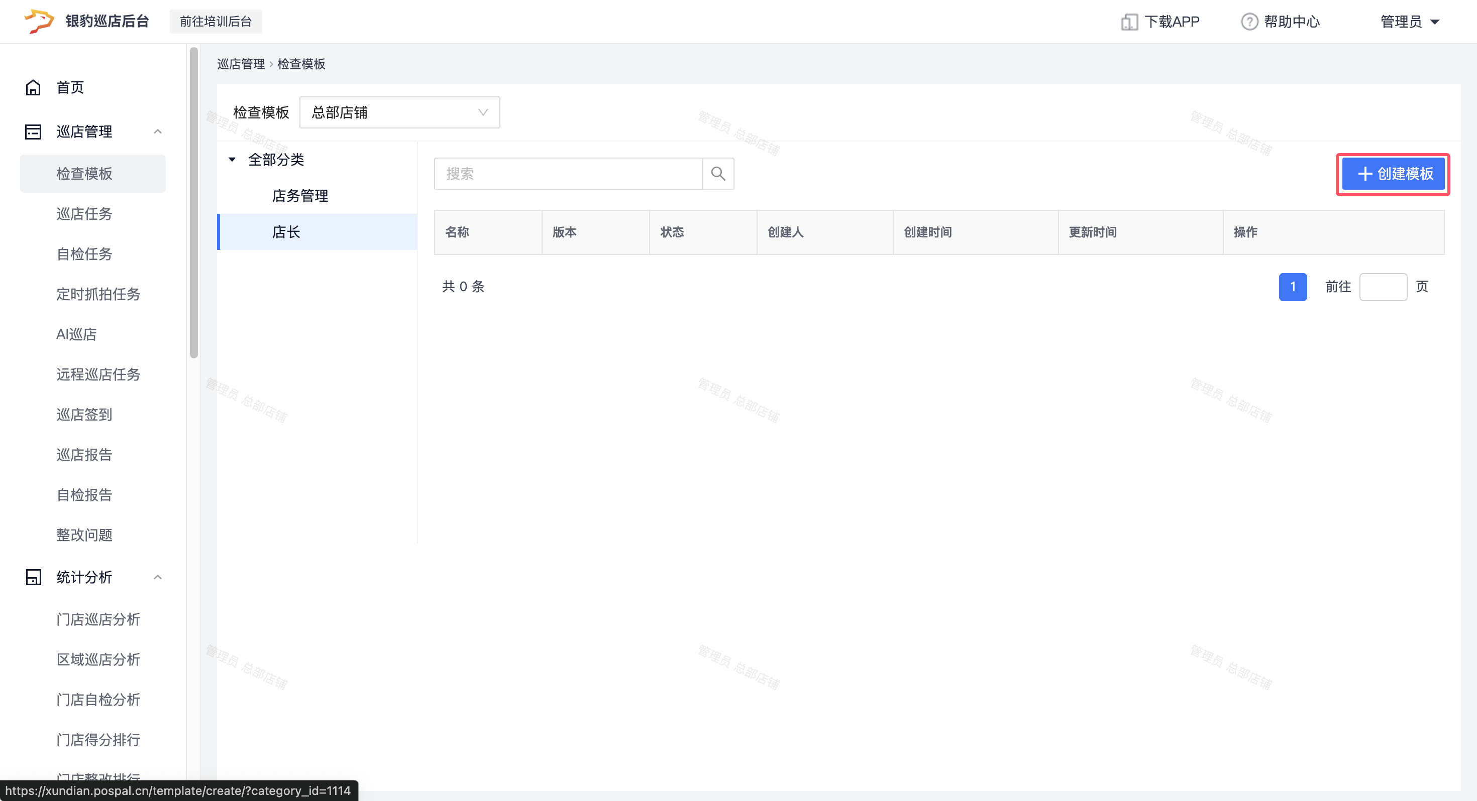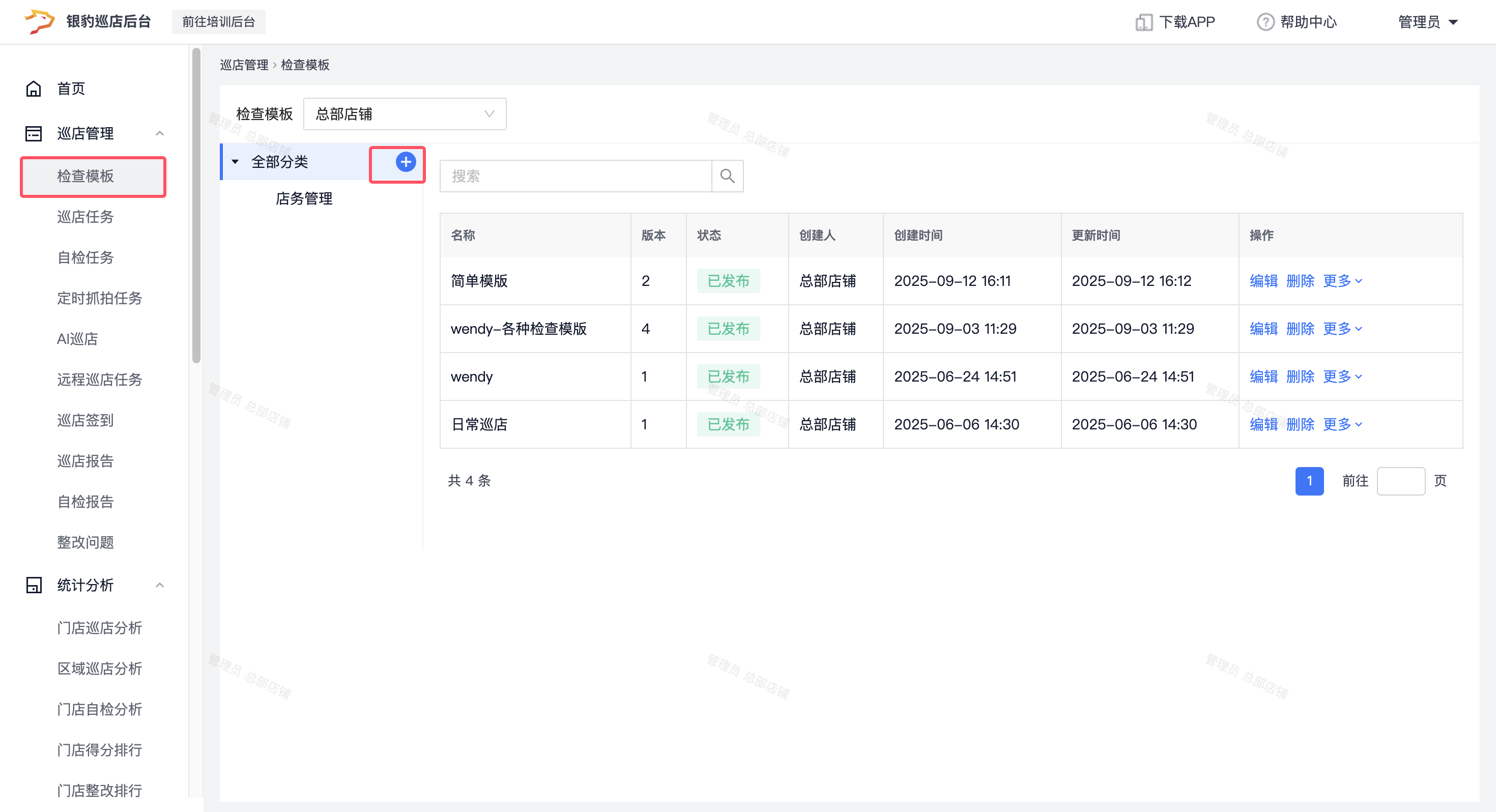 1、进入【巡店管理】-【检查模板】,将光标移至【全部分类】旁,点击出现的【+】按钮,创建模板分类。
