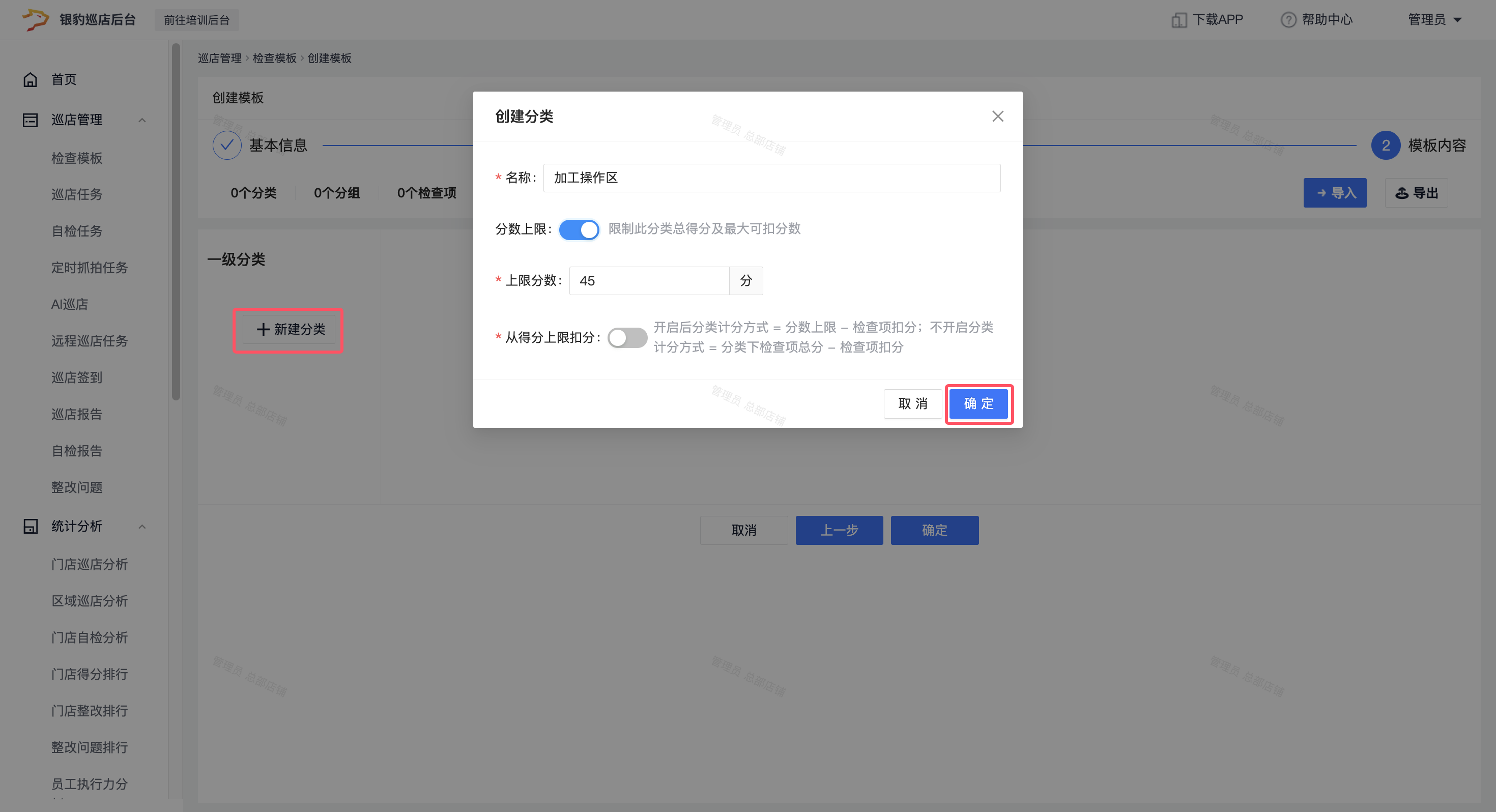 在 “一级分类” 区域点击【+ 新建分类】,弹窗中输入分类名称。若有分数限制,开启【分数上限】并输入数值;需从上限扣分则开启【从得分上限扣分】,完成后点击【确定】。
