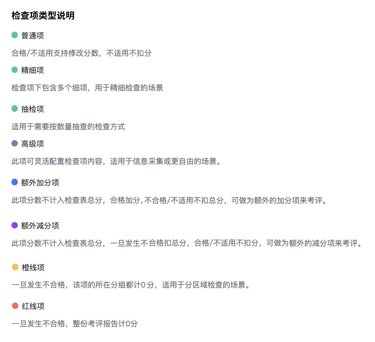 - 评判维度:为了考评数据统一,所有检查项评判维度均按合格/不合格/不适用建档,其中不合格需整改。