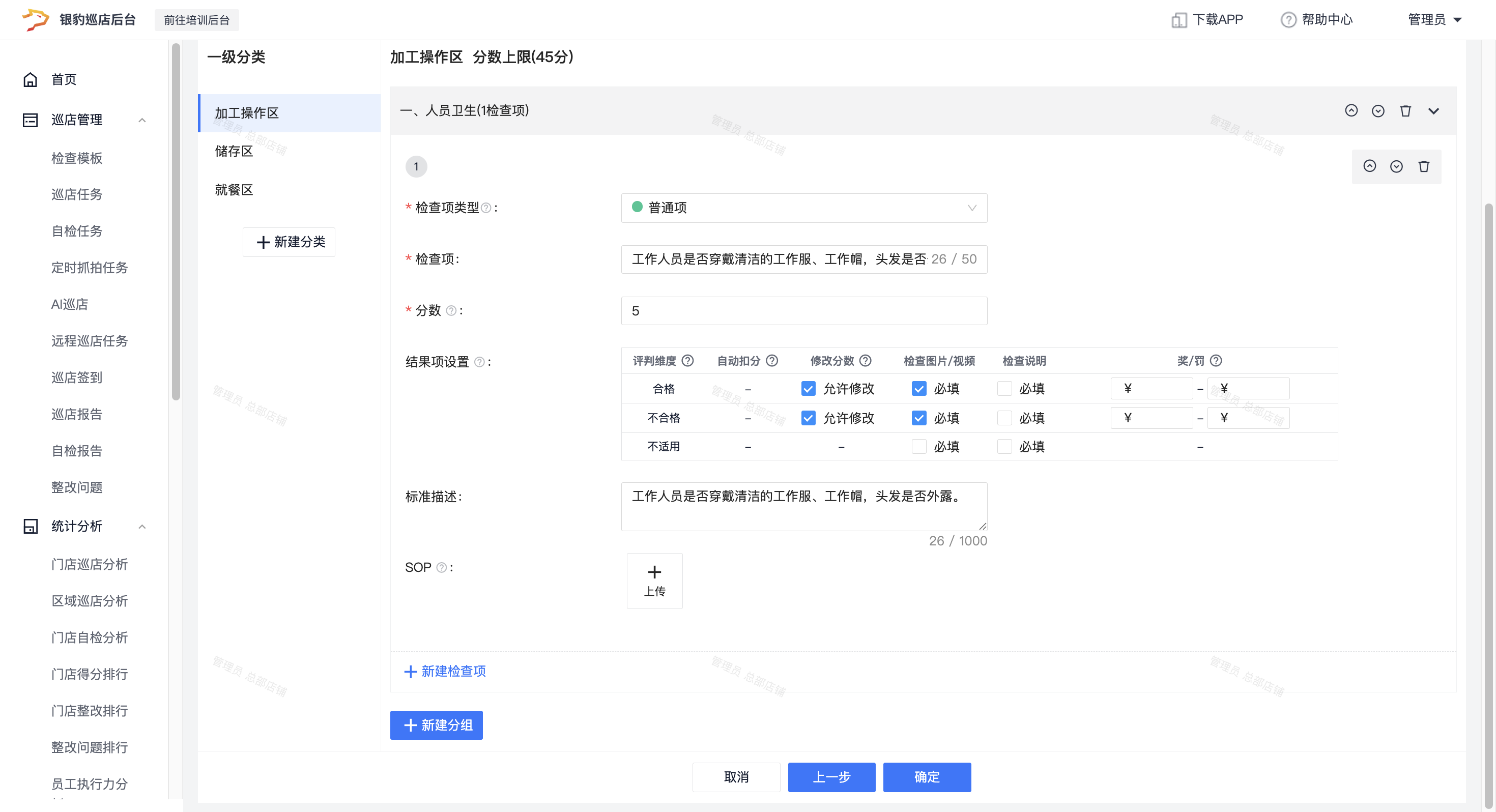 - 自动扣分:填写自动扣分后,APP 端选择结果后将自动扣分,未填则按评判维度的规则,合格不扣分、不合格默认全扣。