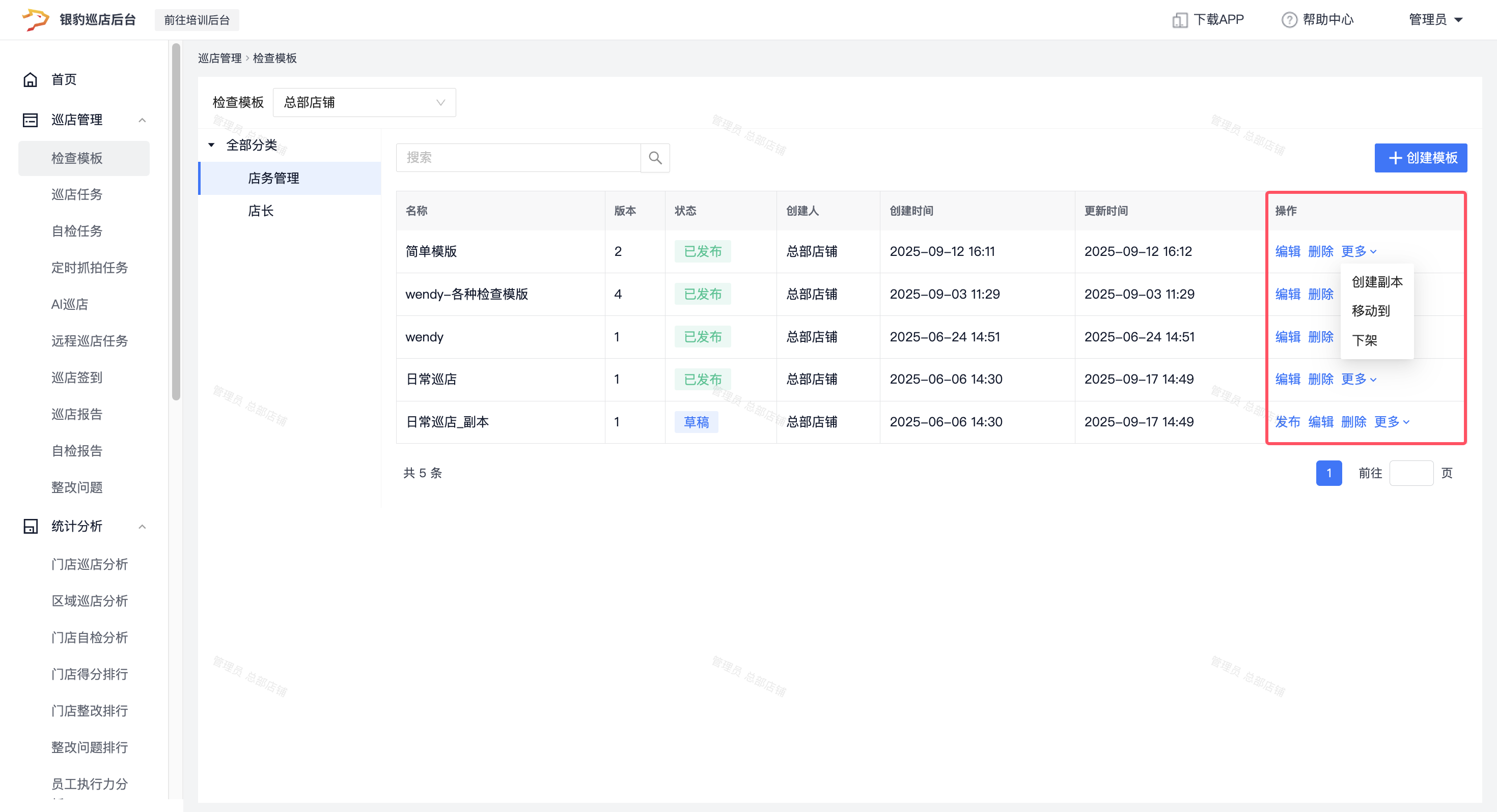 在模板列表页面中,可对模板执行发布、编辑、删除操作;点击【更多】选项,还可进行创建副本、移动至其他分类或下架模板等操作。