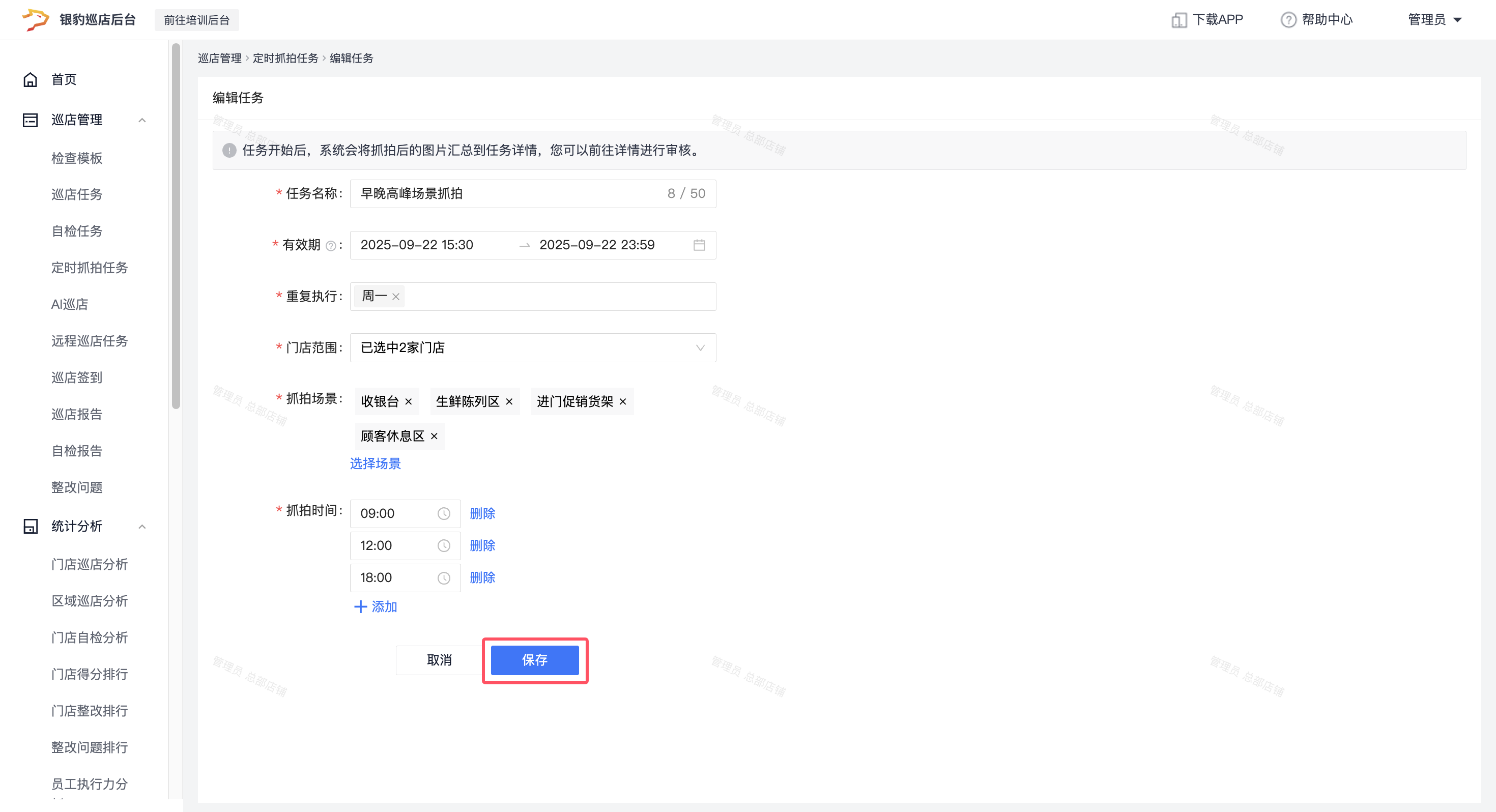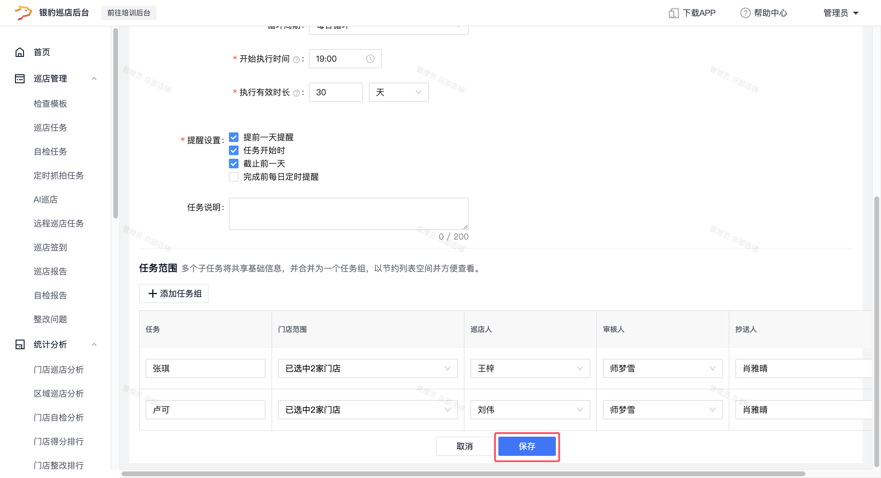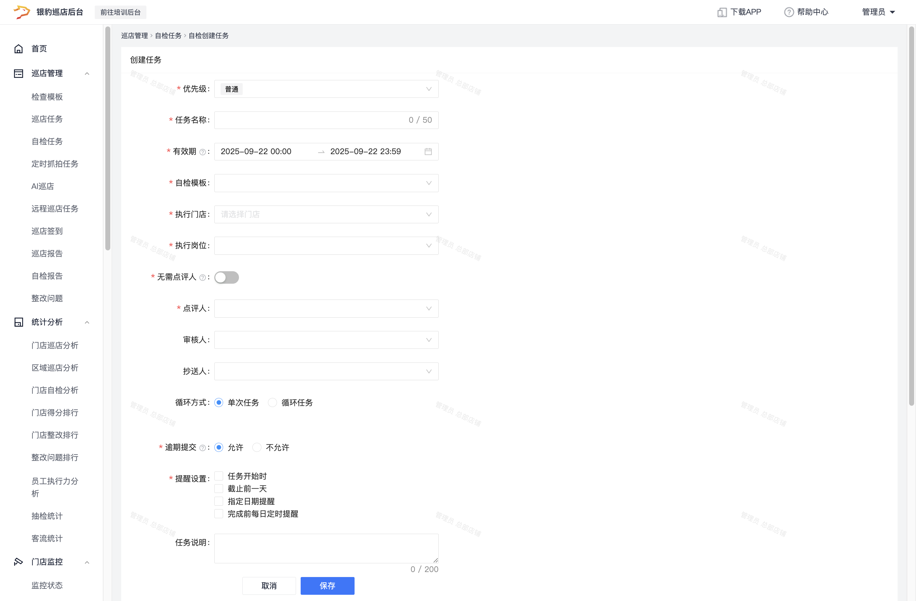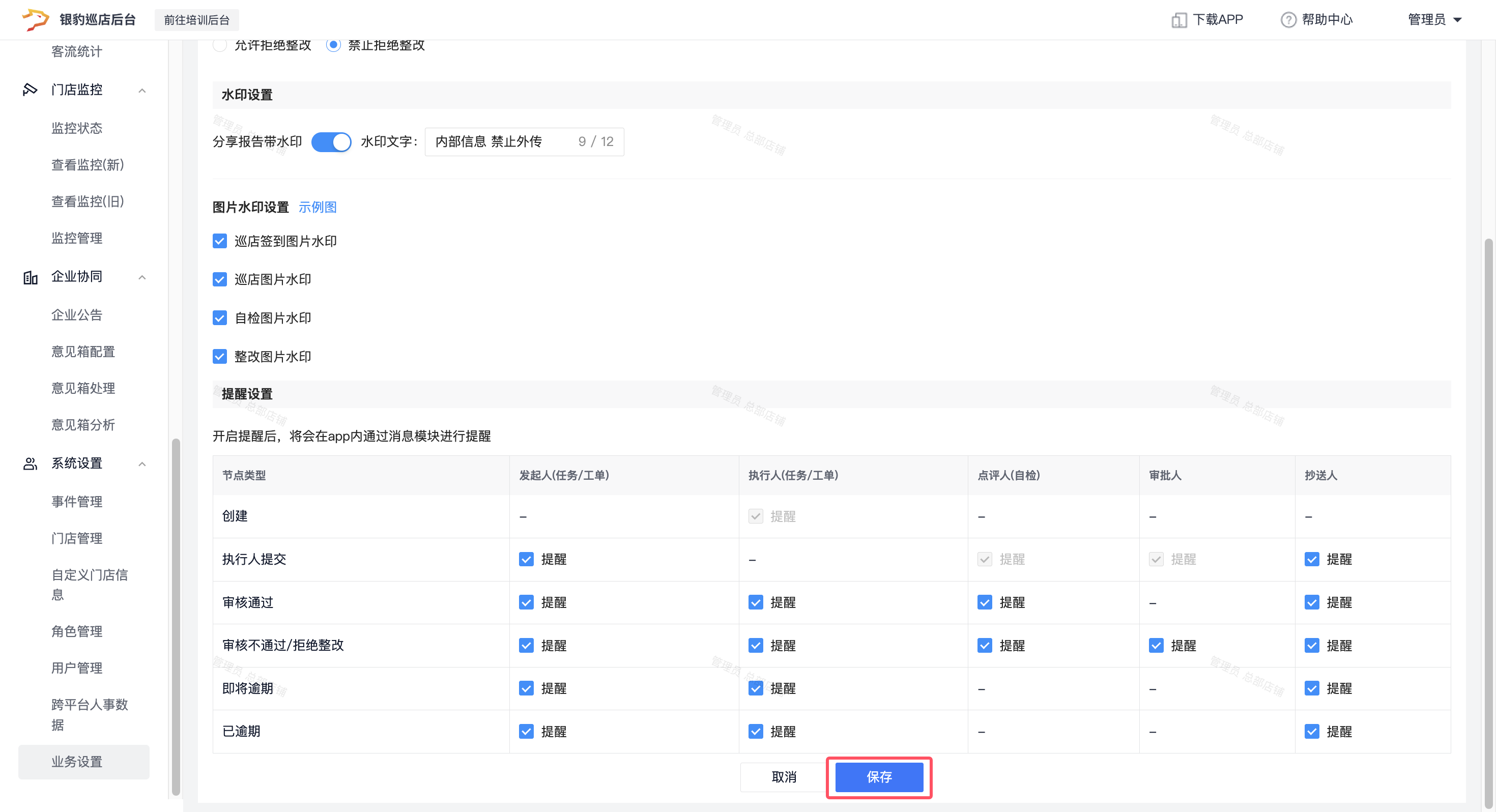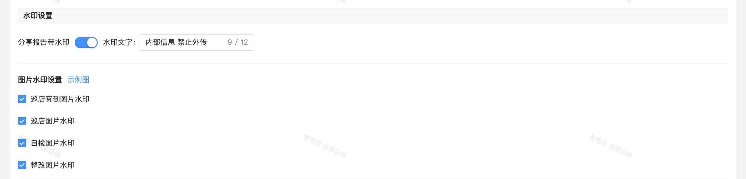 图片水印设置:可根据需求勾选需添加水印的图片类型,包括 “巡店签到图片水印”“巡店图片水印”“自检图片水印”“整改图片水印”。