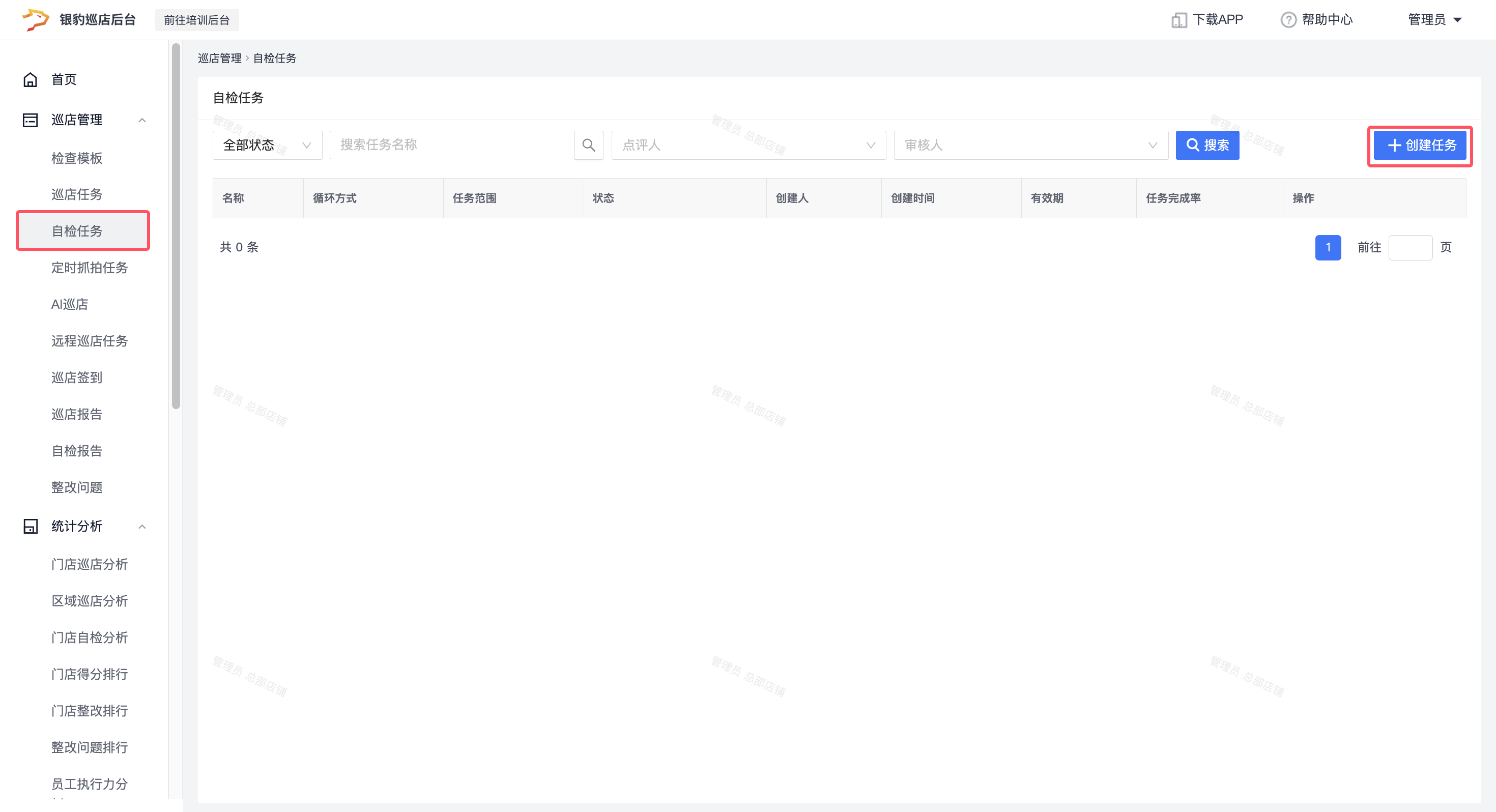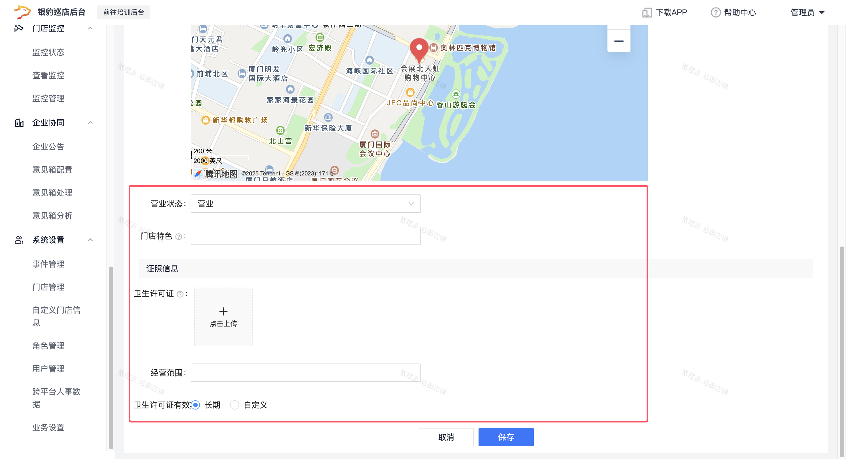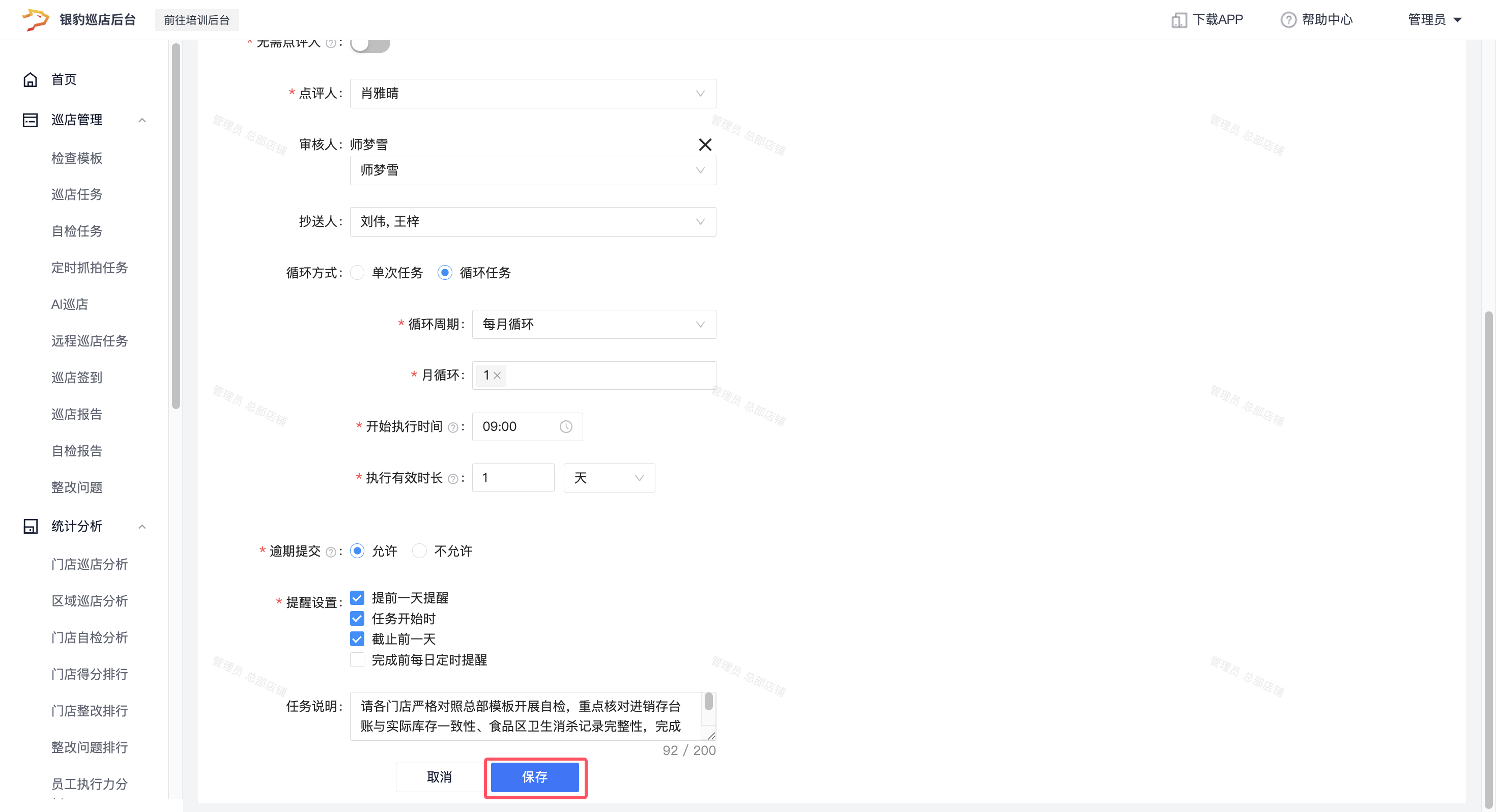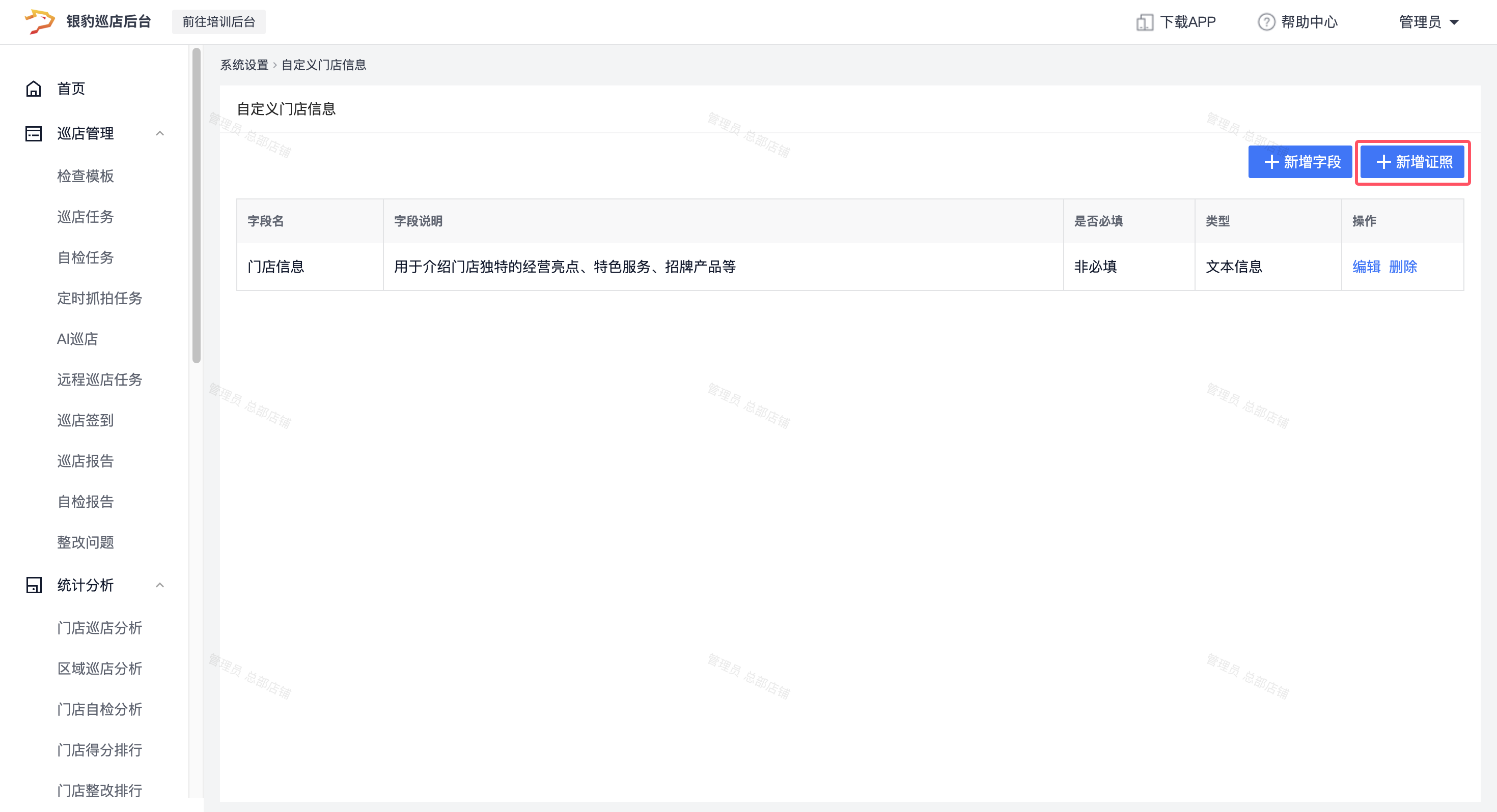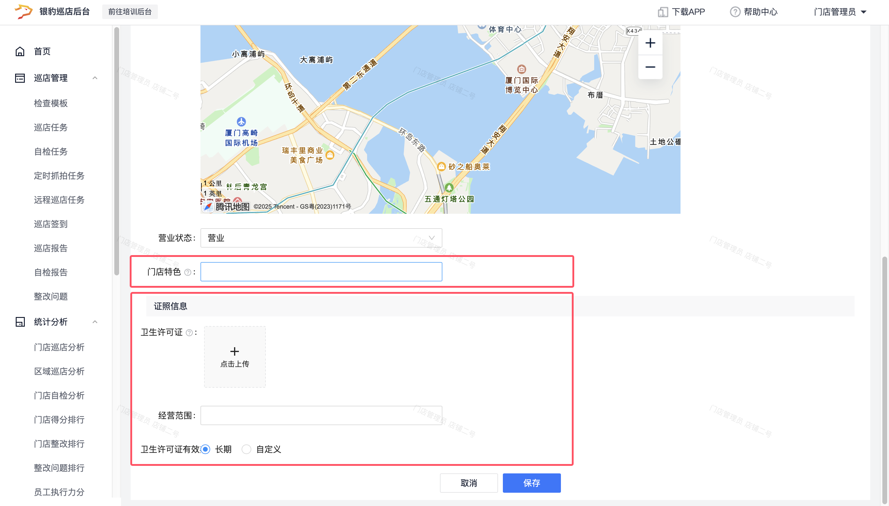 图片水印设置:可根据需求勾选需添加水印的图片类型,包括 “巡店签到图片水印”“巡店图片水印”“自检图片水印”“整改图片水印”。