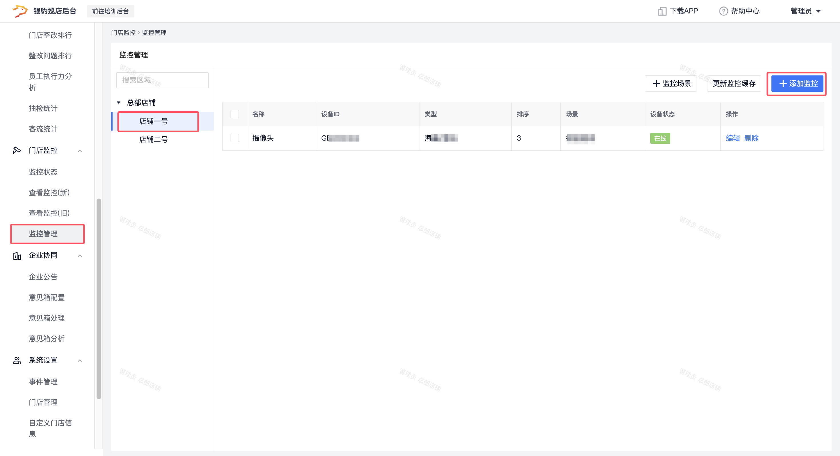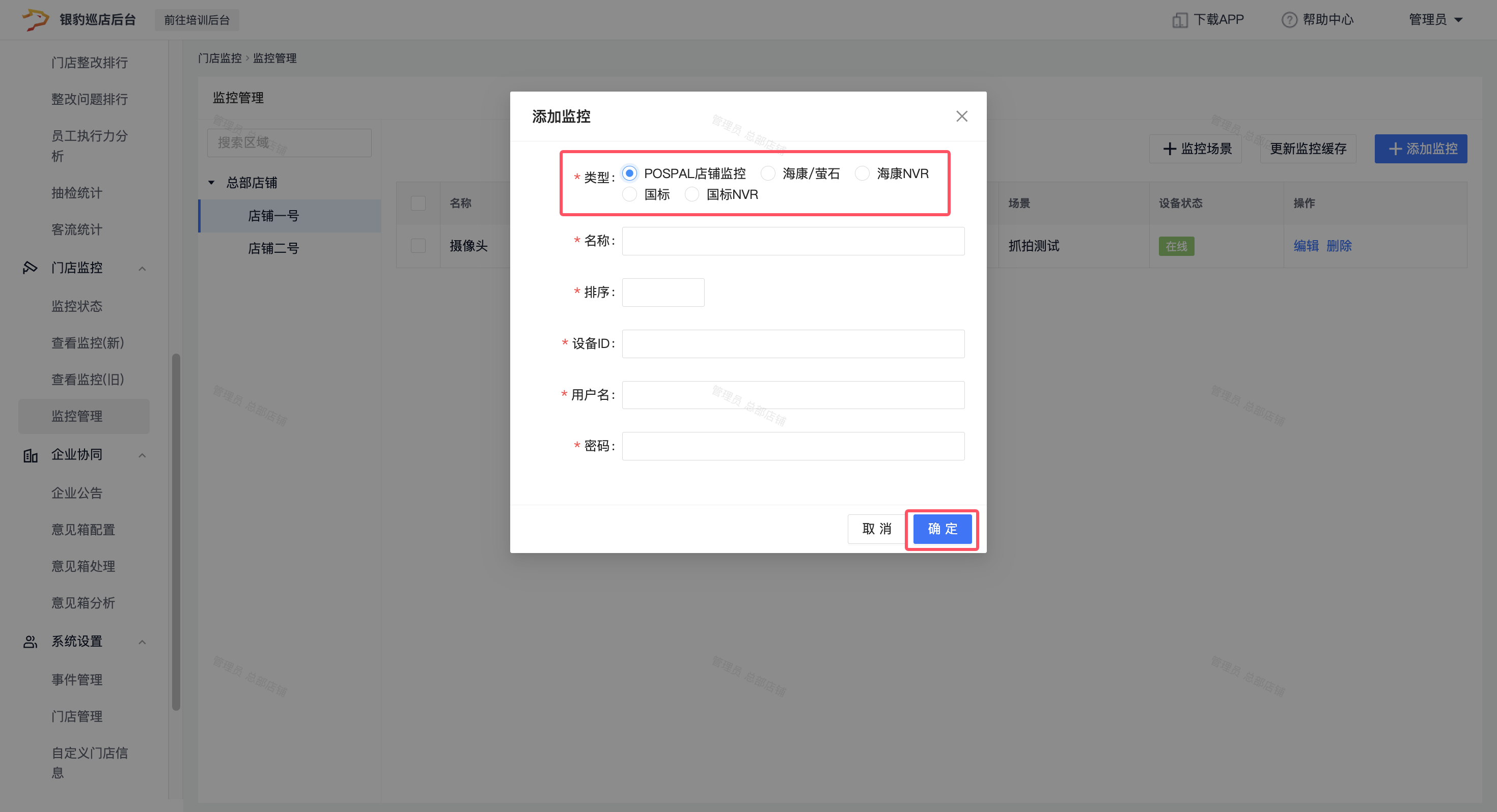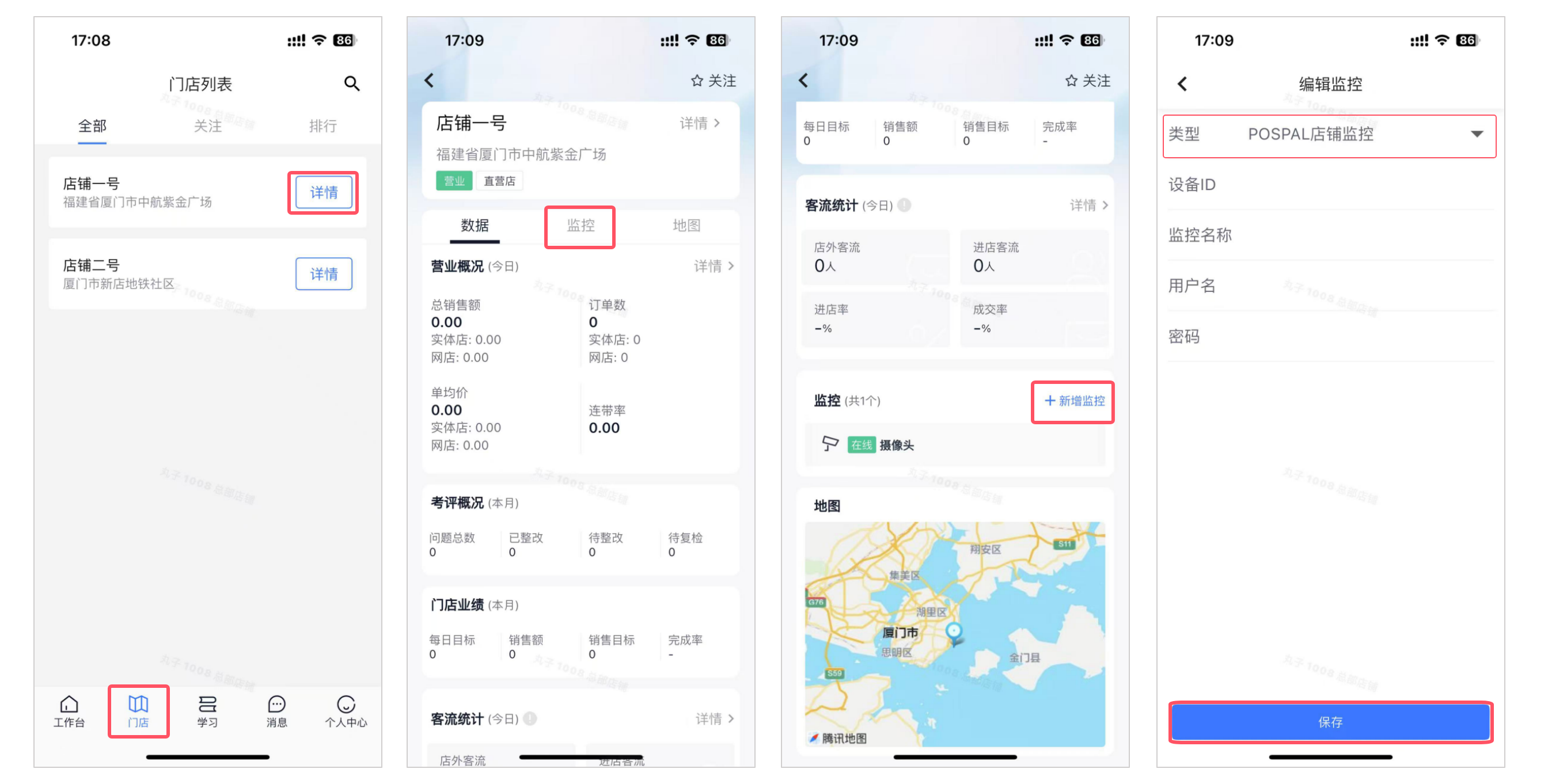 打开巡店 APP 进入【门店】页面,选定目标门店后点击【详情】,在详情页中找到并点击【新增监控】,接着选择监控类型、填写相关信息,最后点击【确定】即可完成绑定。
