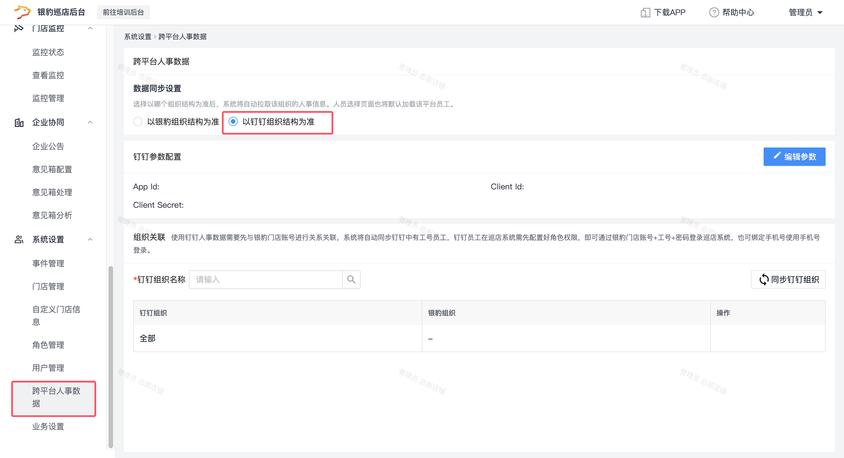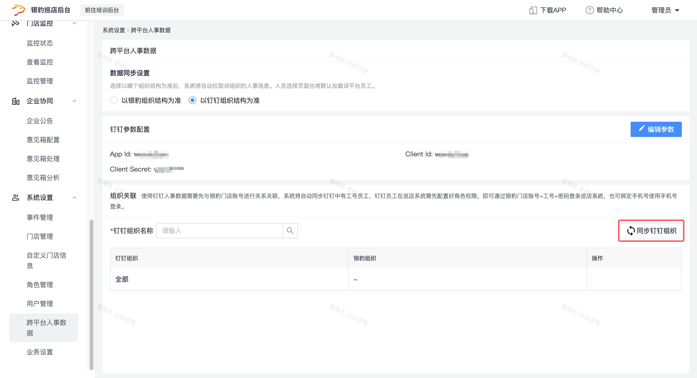 注:此操作会将银豹系统的所有门店员工数据同步到巡店系统,姓名、状态、电话、密码信息将会同步更新。