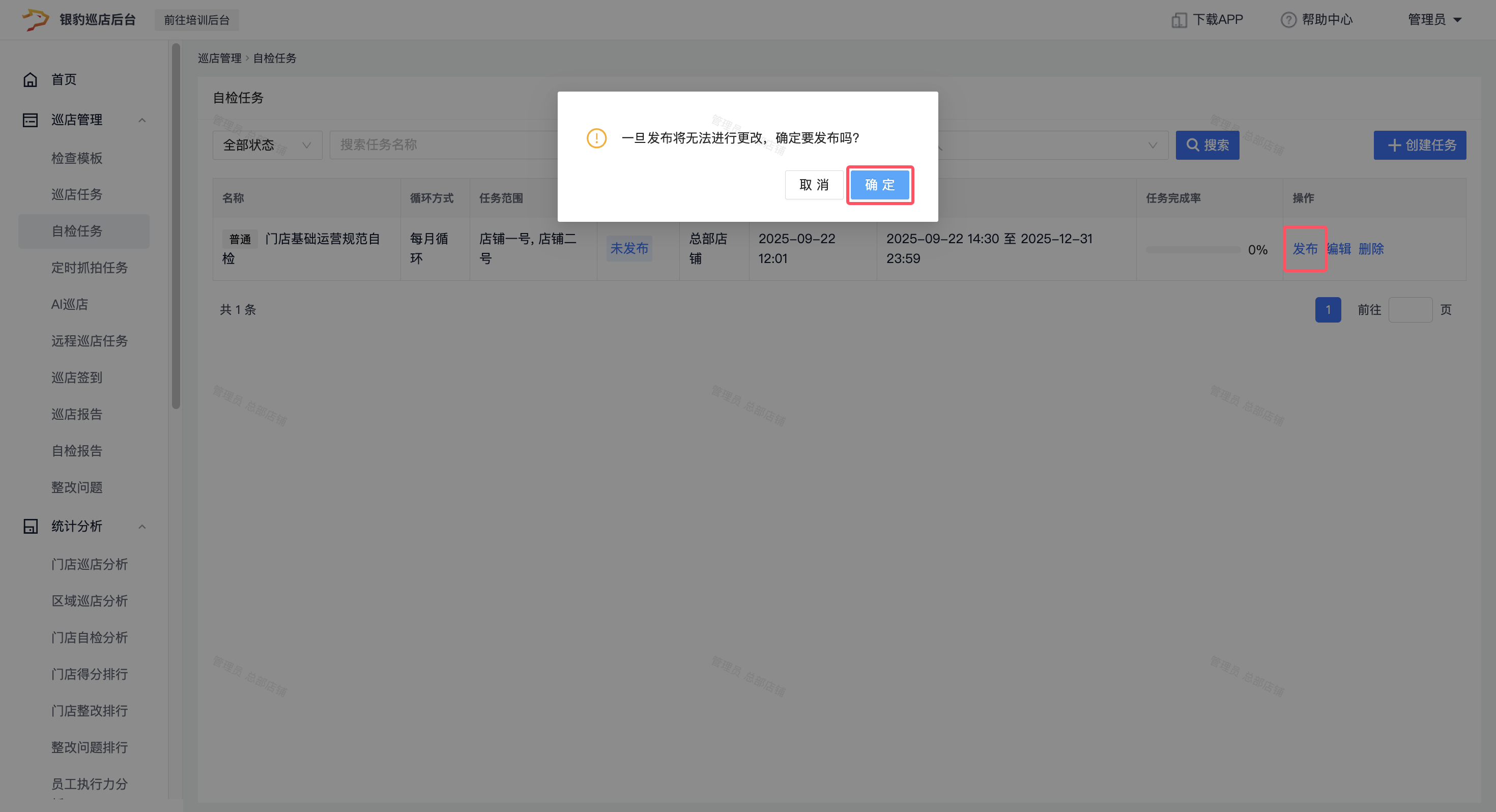 模板保存为草稿后,需执行发布操作方可投入使用。在模板列表中找到目标模板,点击其对应的【发布】按钮,模板即刻生效,状态同步更新为 “已发布”。