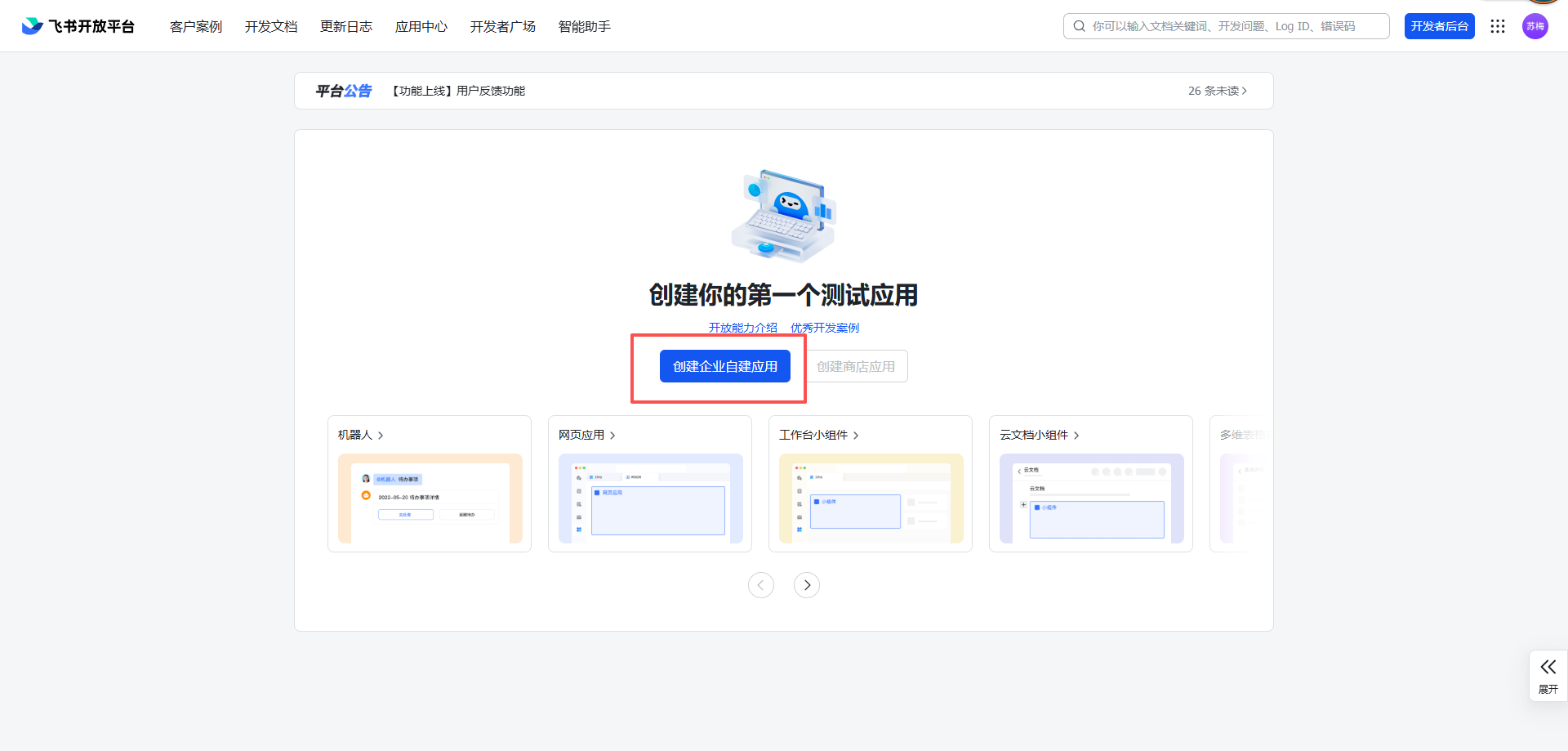 请登录飞书开放平台,链接https://open.feishu.cn/app?lang=zh-CN