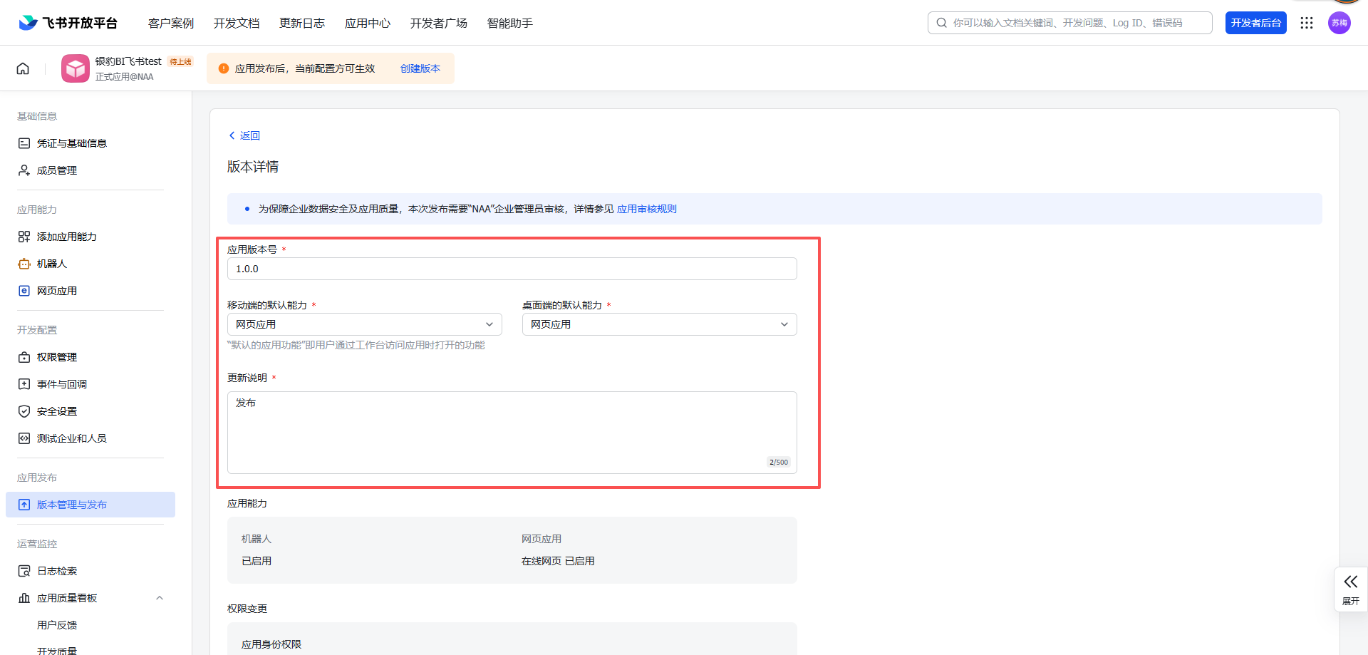 ① 在 「应用发布」 >「版本管理与发布」页面,创建版本并发布