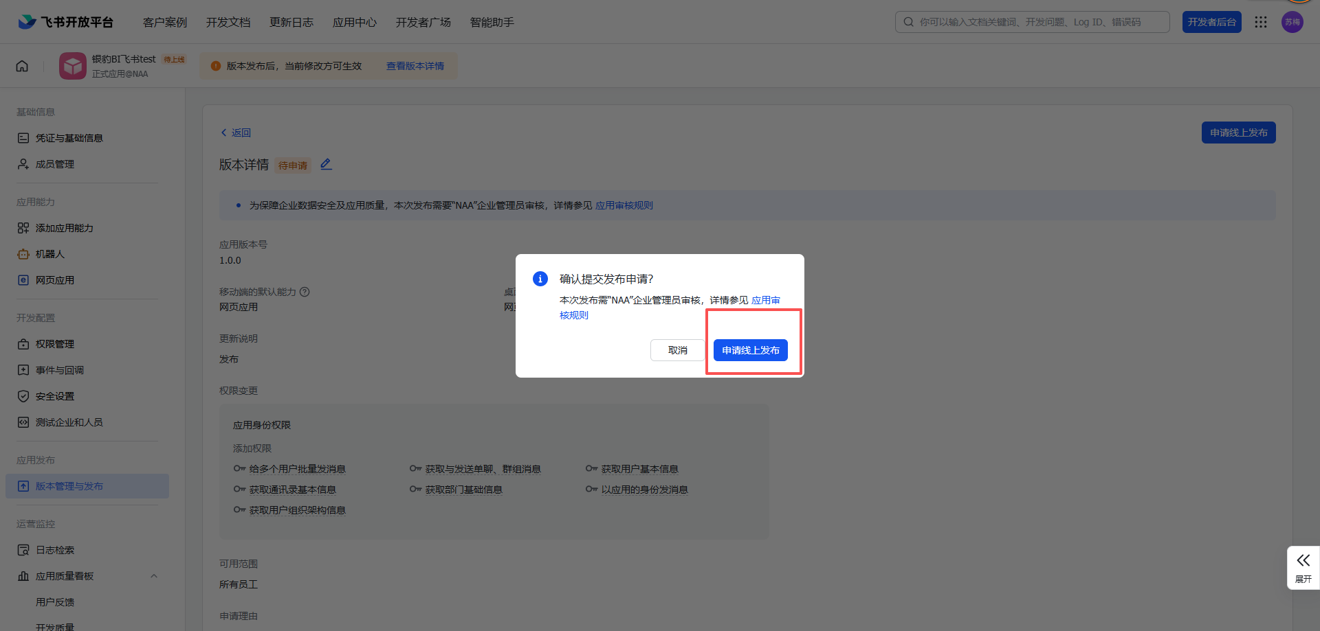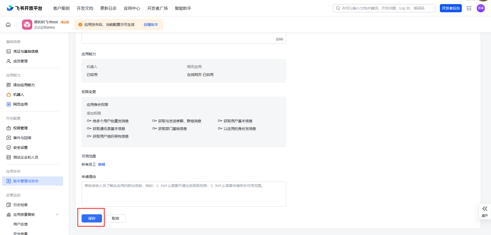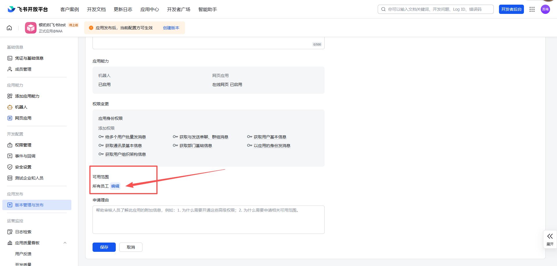 ②按需修改应用的可见范围以及版本描述后,点击「保存」并发布