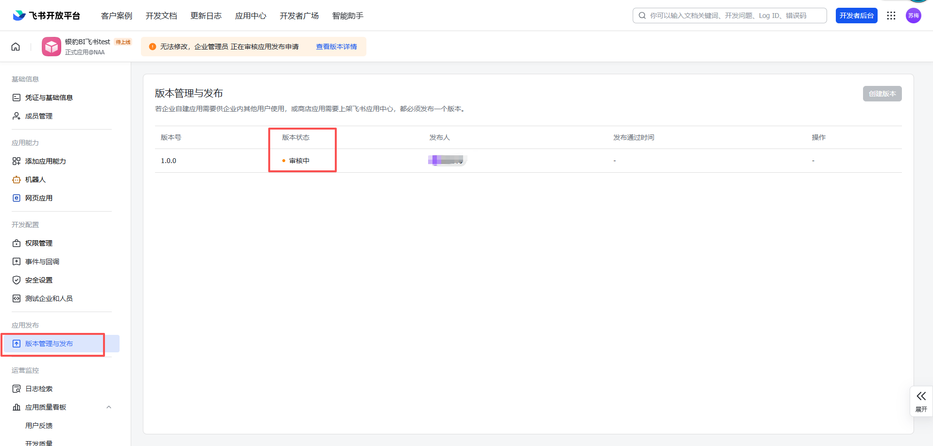 注意:如果在「版本管理与发布」界面,发现版本状态为审核中,请联系企业管理员进行审核