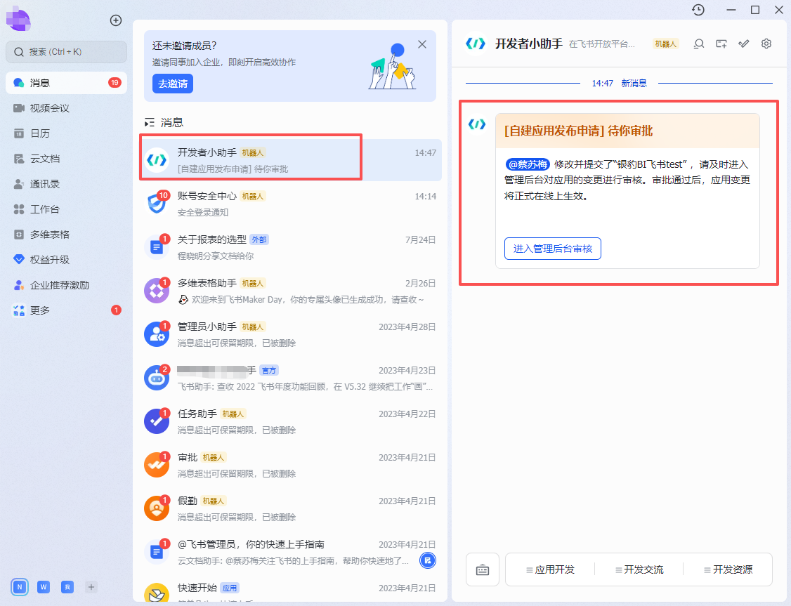 - 消息与群组下的:【获取与发送单聊、群组消息】、【以应用的身份发消息】、【给多个用户批量发送消息】
