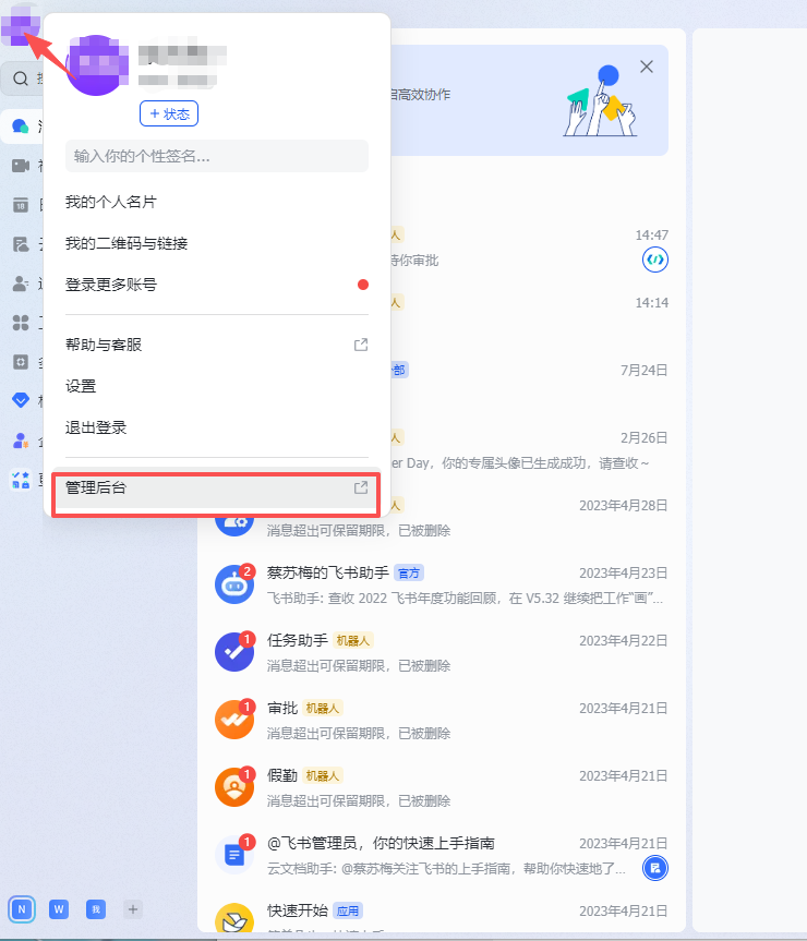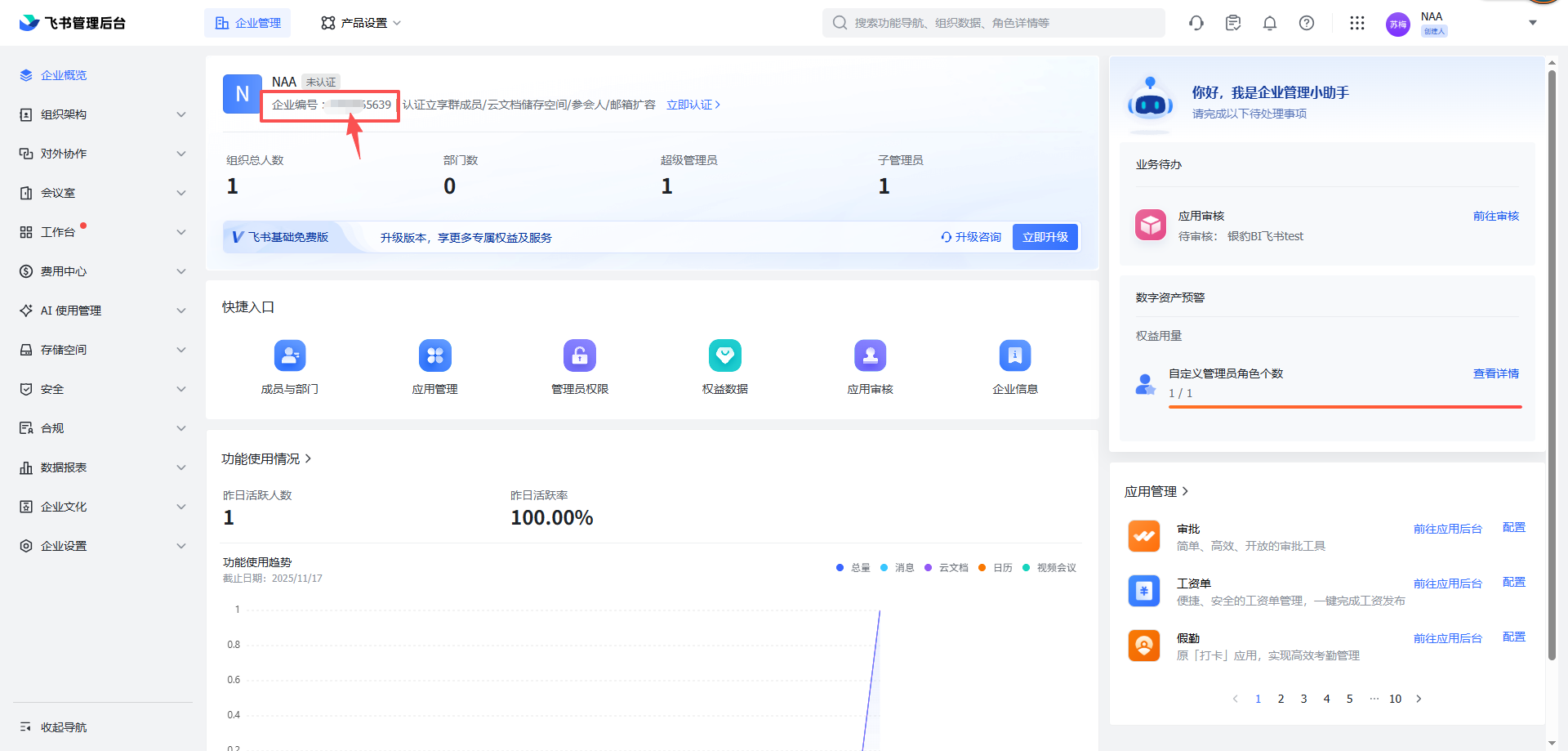 企业ID获取方式二:飞书客户端点击左上角头像,选择【管理后台】,在上部中间找到【企业编号】
