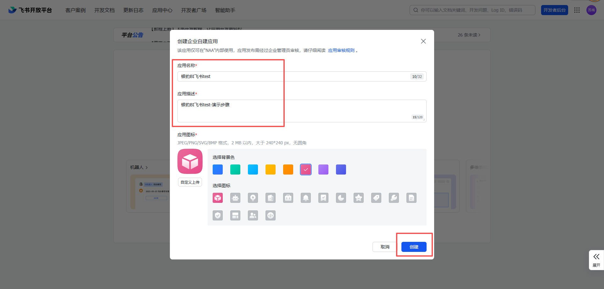 输入应用名称和描述,以及上传应用图标,并点击「创建」