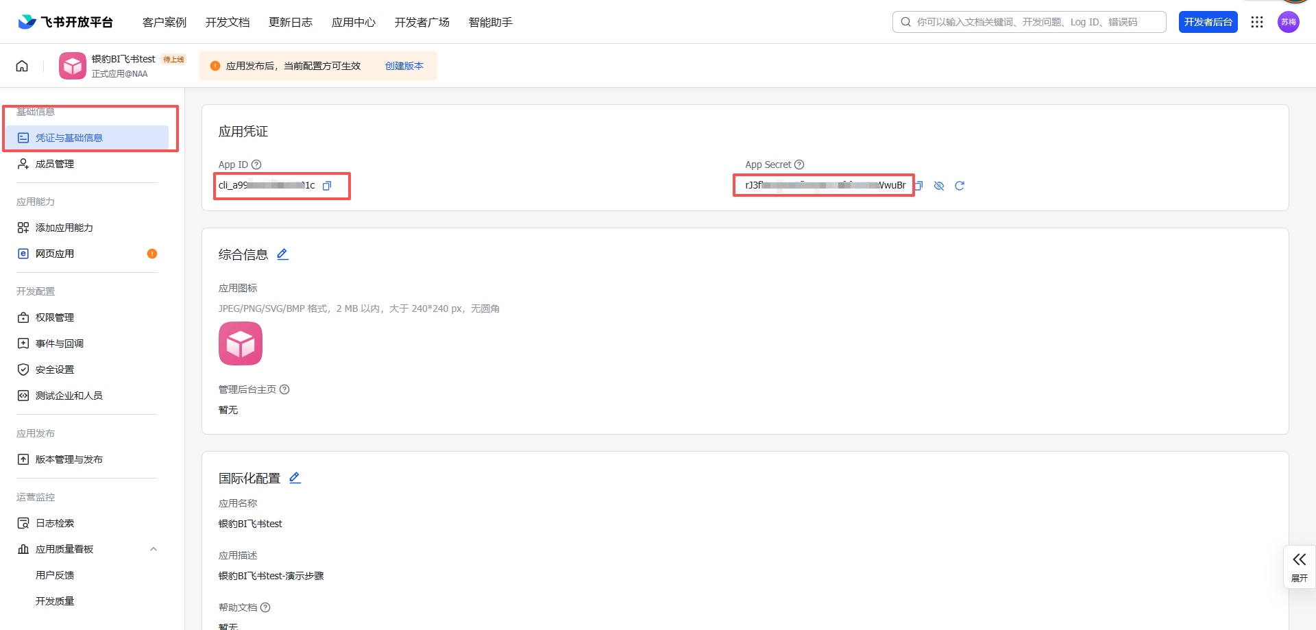 在「凭证与基础信息」界面,获取APP ID和APP Secret并记录下来