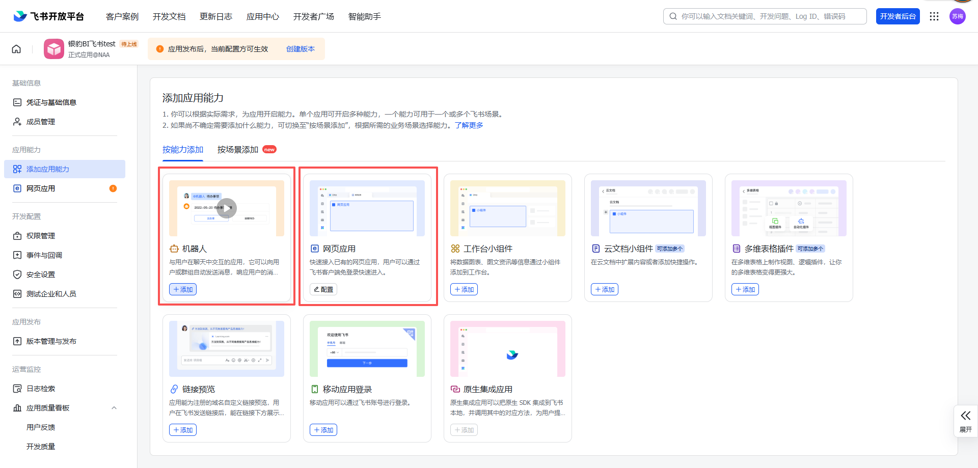 在 「应用能力」 >「添加应用能力」页面,添加「网页应用」和「机器人」