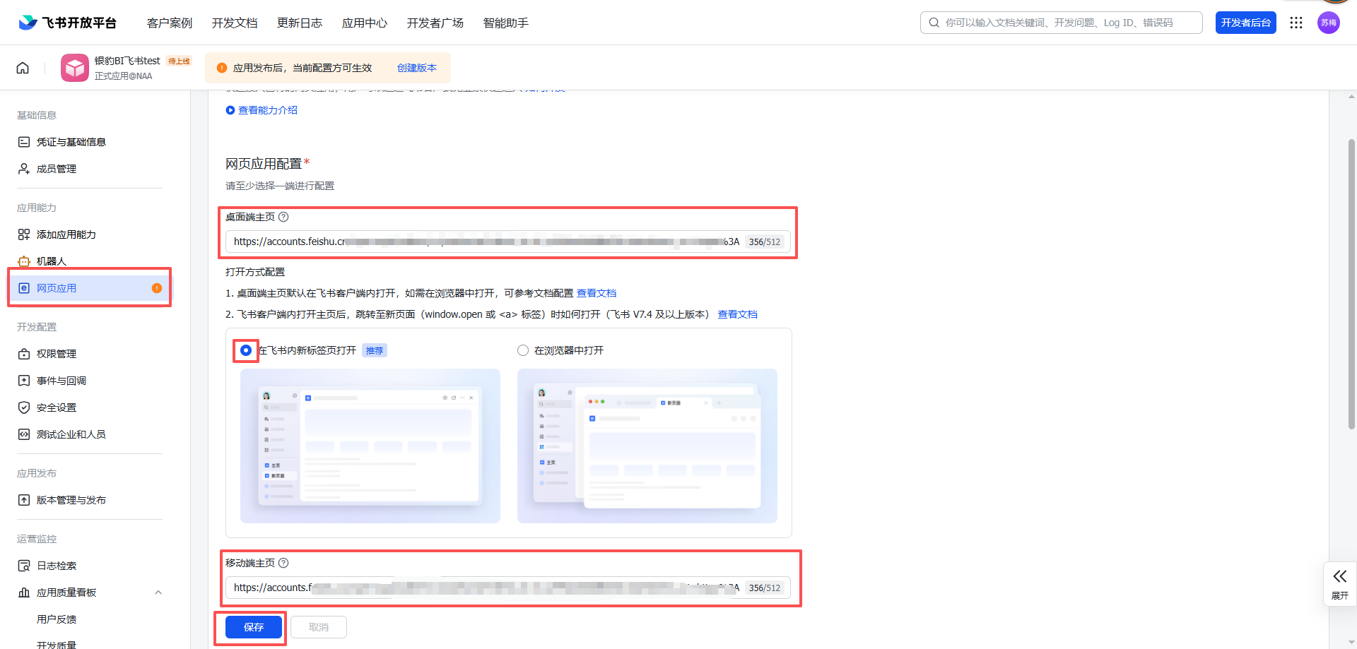 进入「网页应用」下,填写「桌面端主页」及「移动端主页」地址