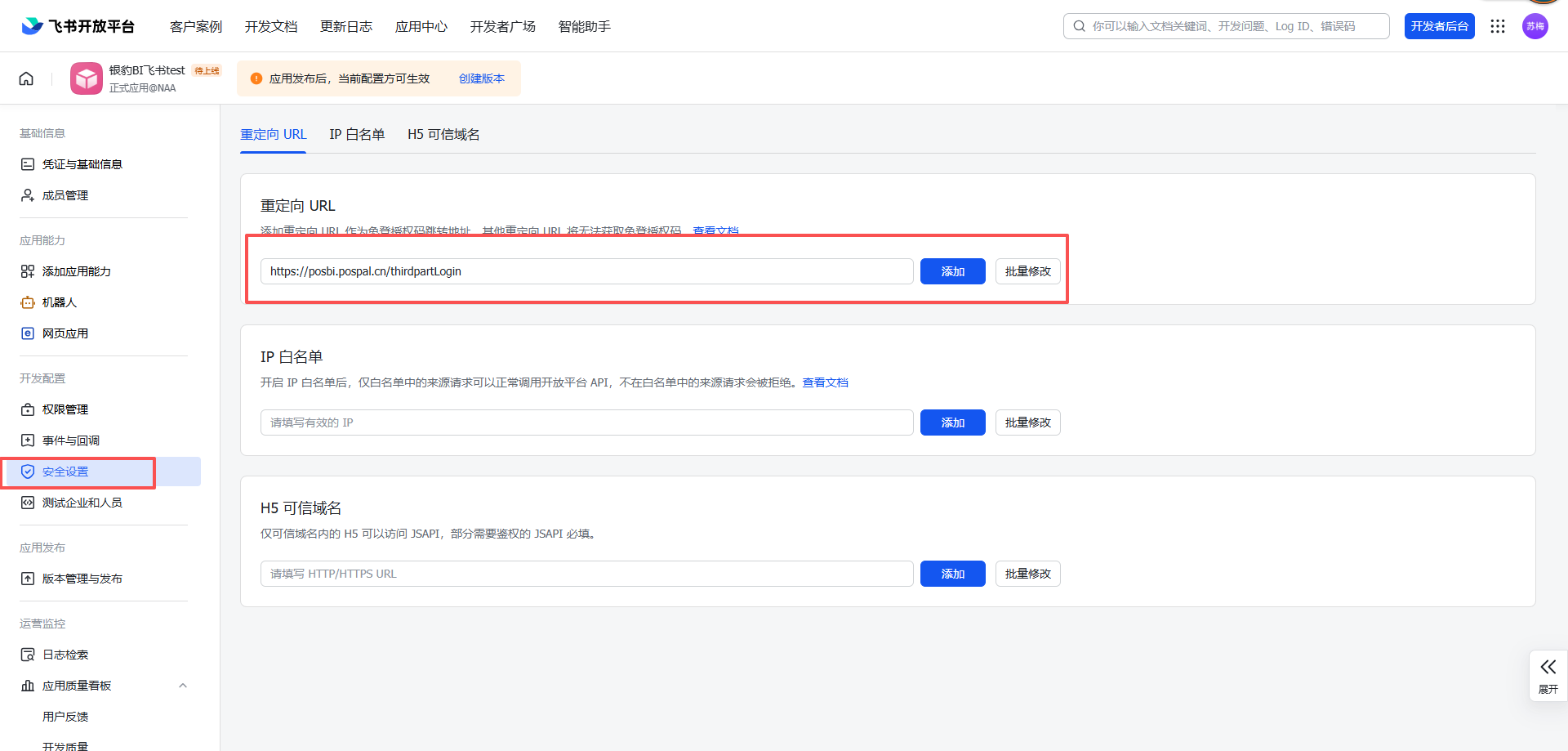 在 「开发配置」 >「安全设置」页面,【重定向URL】配置为 :https://posbi.pospal.cn/thirdpartLogin