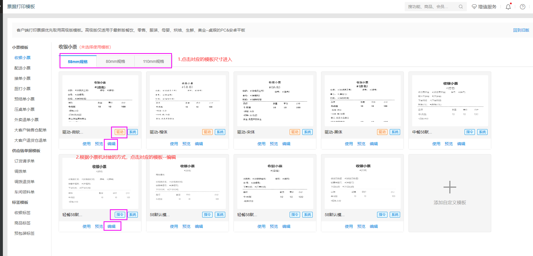 1.请登录收银后台,点击【设置】--【票据打印模板】,重新保存下收银(厨打)小票模板,并确保此处模板大小与小票纸实际大小是一致的。