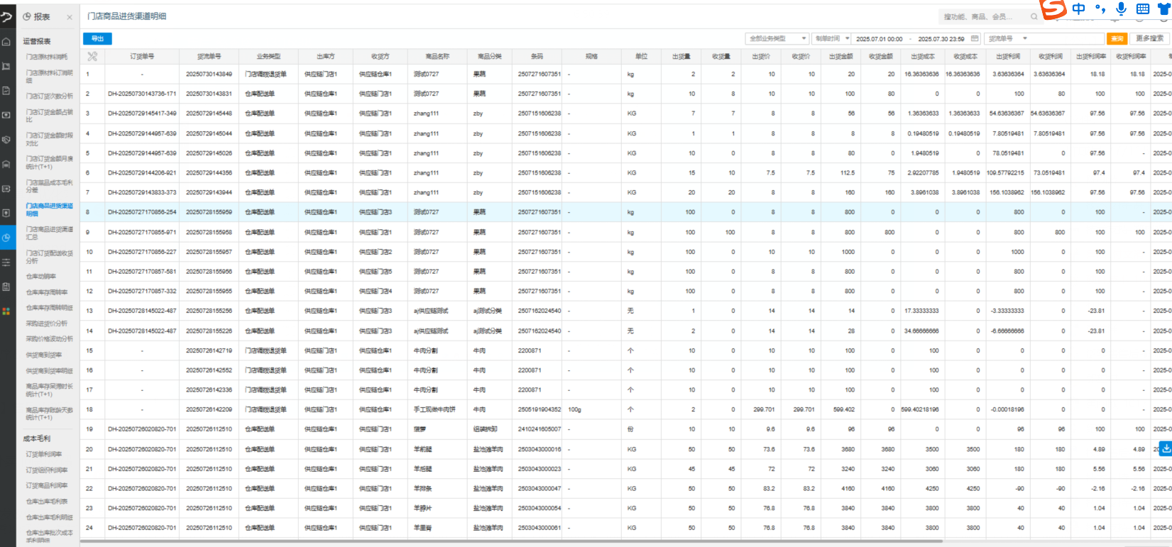 登录后台,进入供应链板块,点击【报表】-【门店商品进货渠道明细】,可以选择查看具体商品以及货单的进货明细信息。