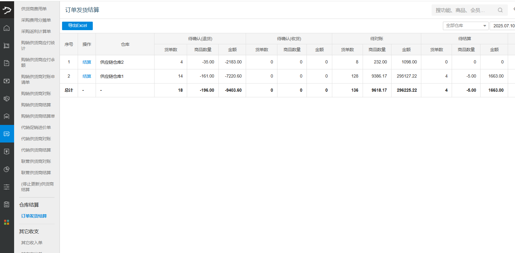 后台登录供应链板块,点击【结算】-【仓库结算】-【订单发货结算】中,可以操作仓库结算。