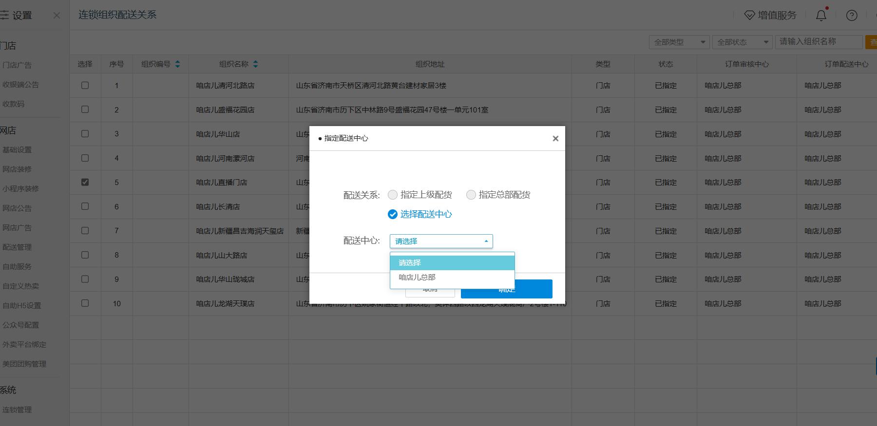 第一步:登录总部账号后台--【设置】--【连锁组织配送关系】中,将区域管理账号的配送中心设置为指定总部指定配货