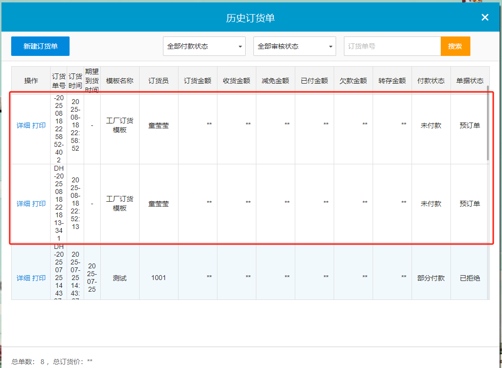 2)若开启了【员工提交订货需要店长审核】功能,那么工号下单后需要登录我的店铺操作审核后才能提交,若没有审核也会显示预定状态,审核通过后,云端才会正常显示该订单。
